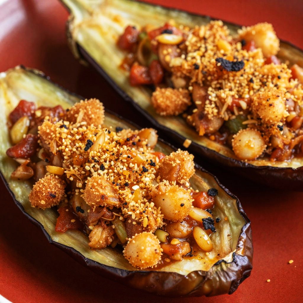 Close-up photo of two roasted eggplant halves filled with a crispy, golden-brown topping. The topping looks chunky with bits of red sauce and has a slightly charred texture. The eggplant skins are slightly curled and have a dark, roasted appearance. The background is a rich, red surface that contrasts with the eggplant and topping. The image is brightly lit, highlighting the textures and colors.