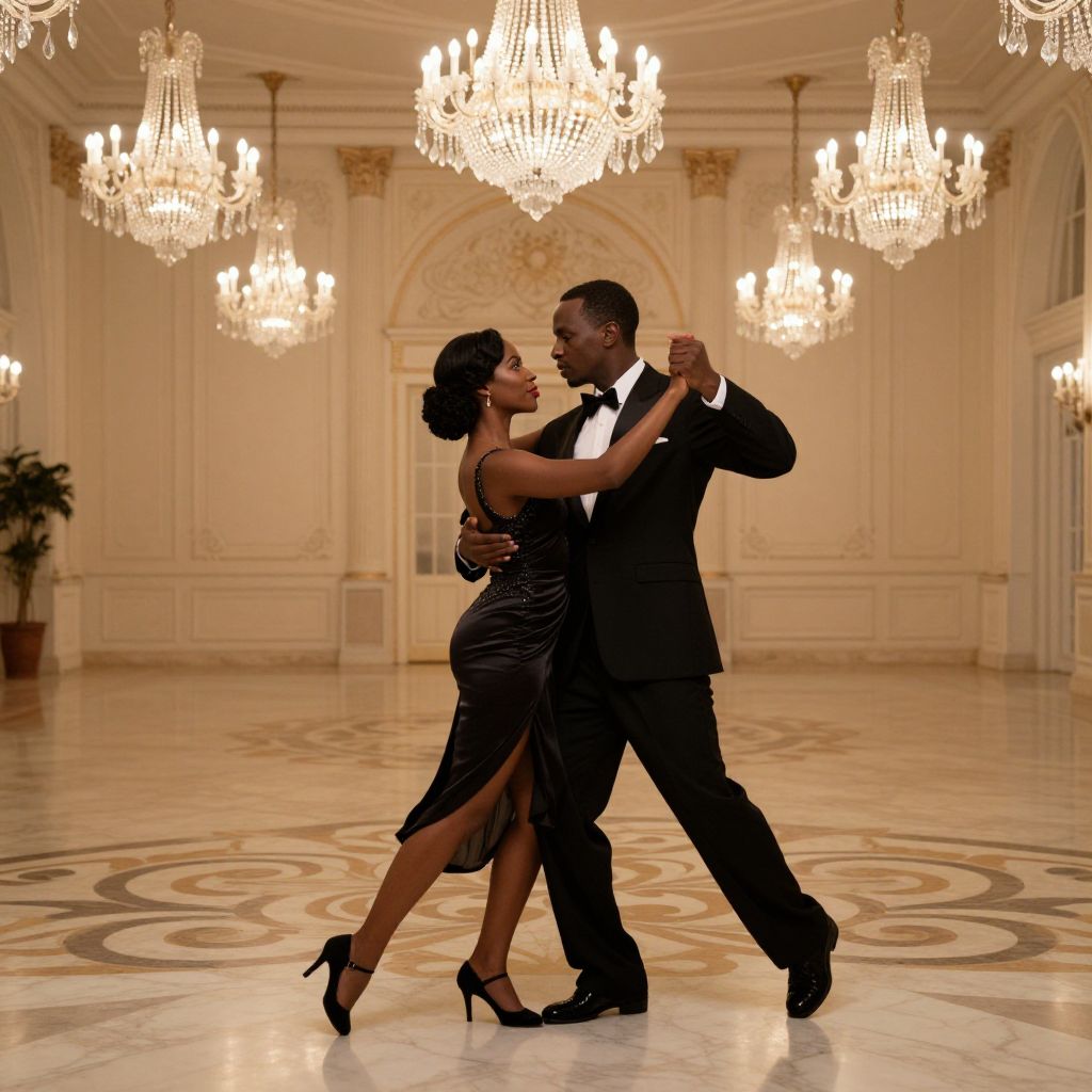 Elegant_ebony couple dancing in a luxurious ballroom, crystal chandeliers overhead, intricate marble floors, the woman in a sleek evening dress and the man in classic black suit, romantic mood with warm ambient lighting