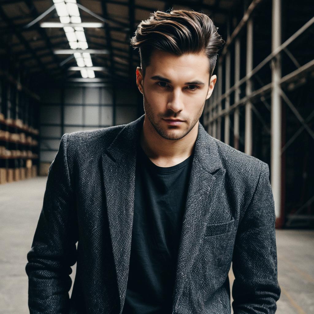 Disconnected Faux Hawk hairstyle on man, wearing elegant blazer, in industrial warehouse, captured in fashion editorial style with softbox lighting.