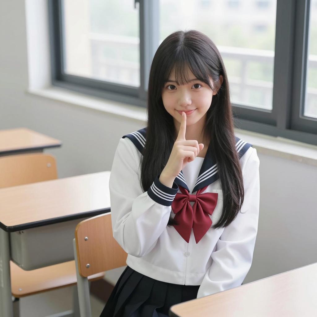 Asian woman with long black hair, wearing a navy blue and white Japanese school uniform with a red bow, sitting on a wooden desk. She has a finger to her lips, looking at the camera. White knee-high socks, navy skirt, green chalkboard in the background. White wall, power outlet on the left. Bright indoor lighting. 1 person.