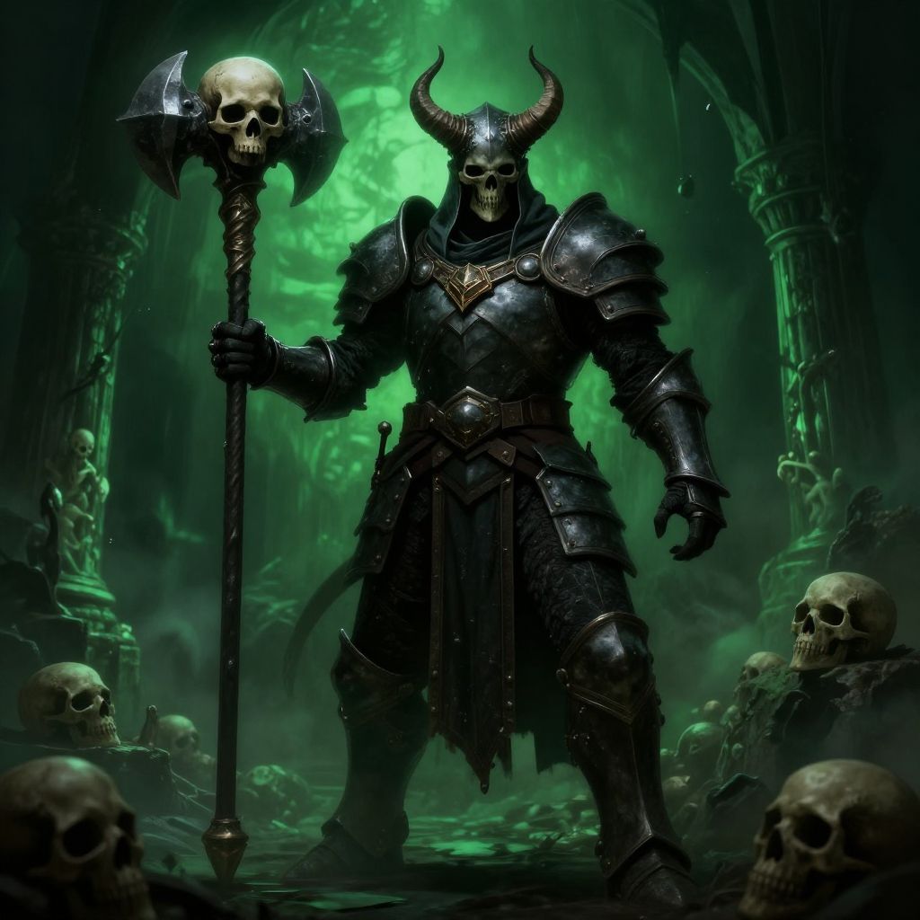 Digital fantasy artwork of a dark armored demon with horns holding a skull-topped axe, surrounded by skulls in a green-lit, eerie, ruins background