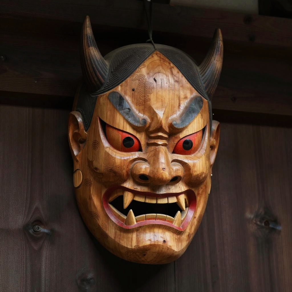 Wood oni mask carved from aged cedar, featuring fierce red eyes and sharp fangs, intricate traditional Japanese details, hanging on ancient temple wall, soft ambient light, dark moody atmosphere, high detail, cinematic composition