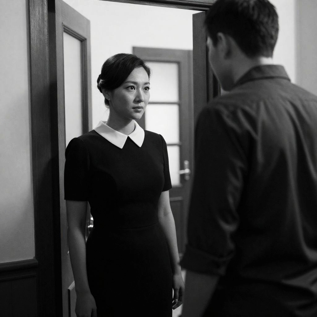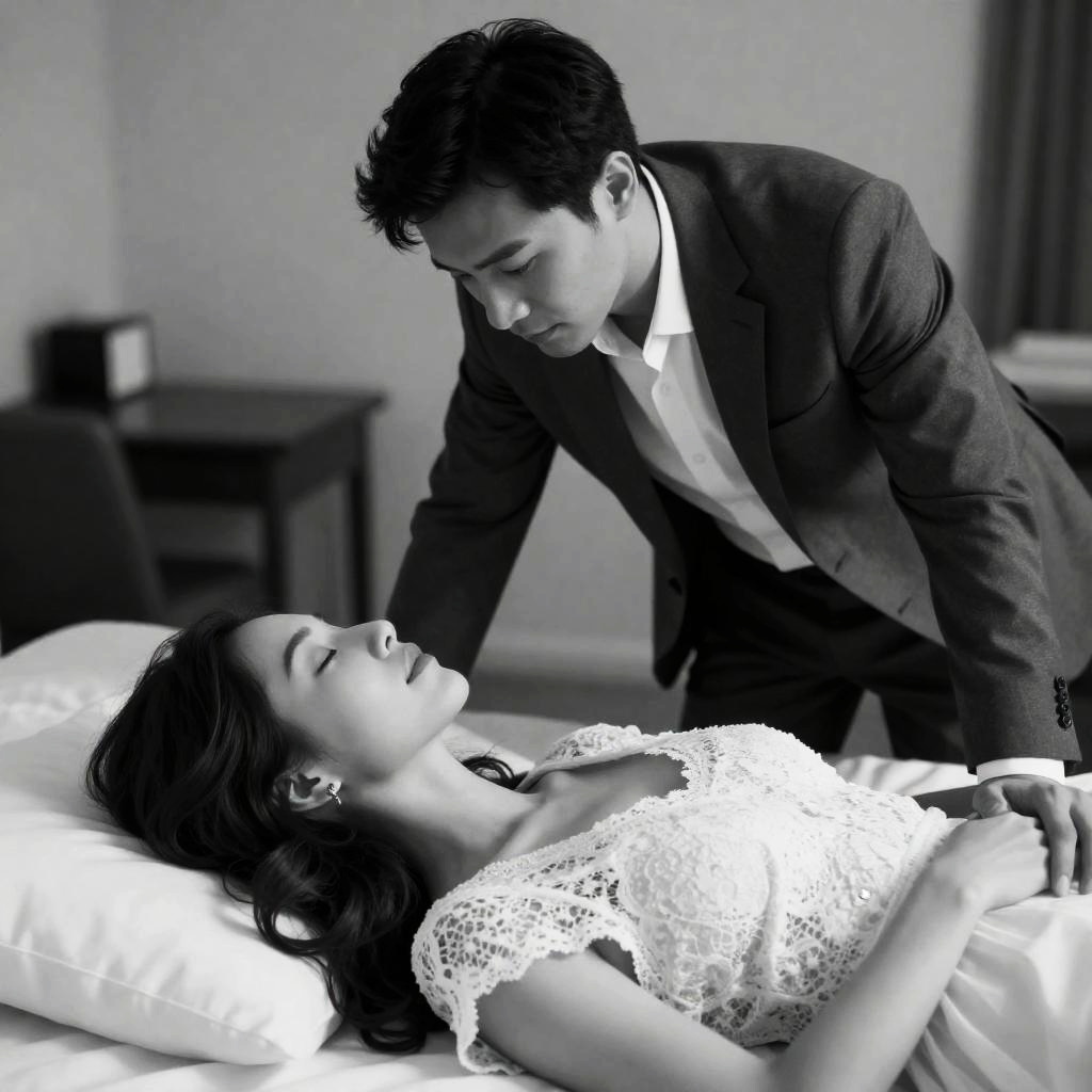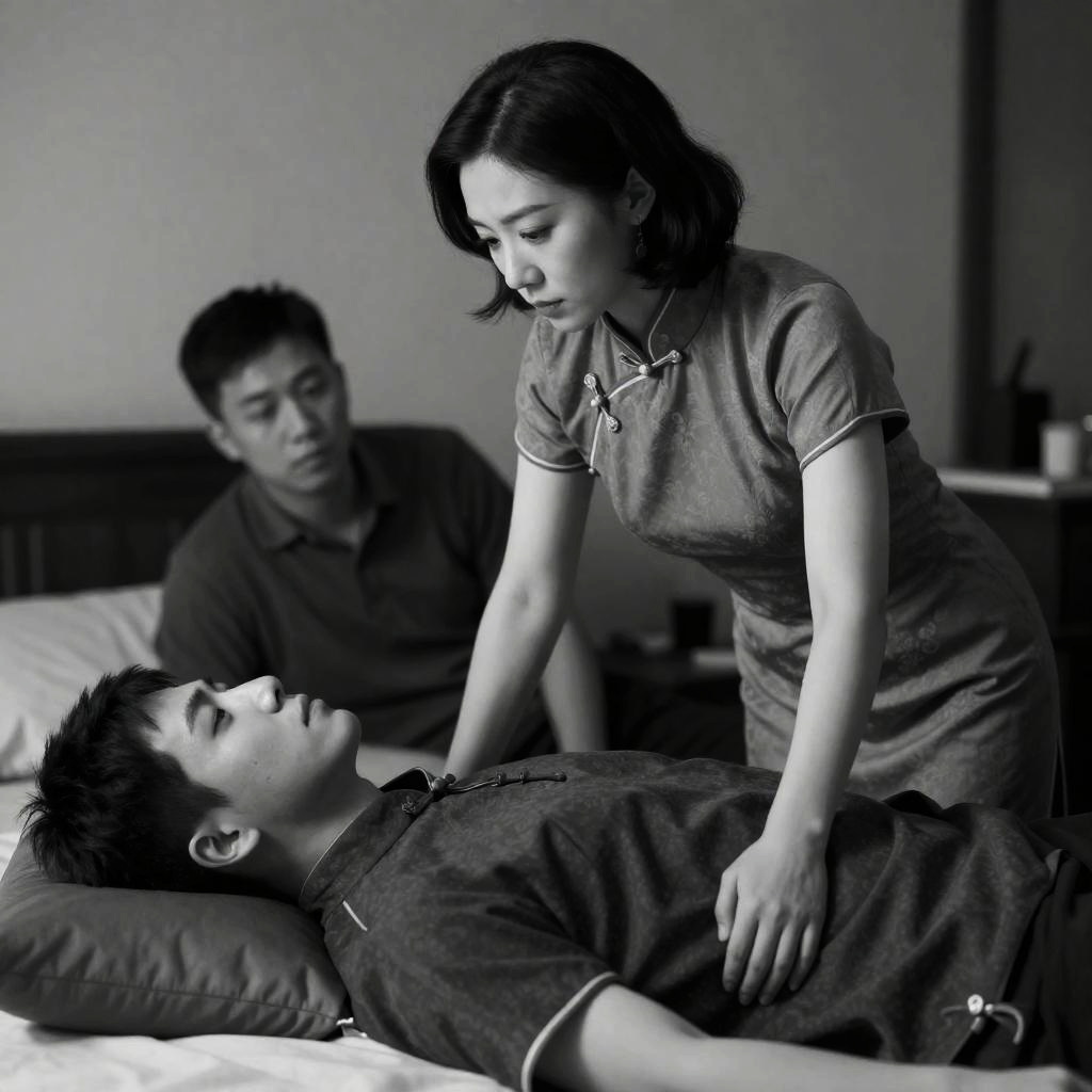 Black-and-white photograph of a woman with dark hair in a traditional Chinese dress, leaning over a bed with a man who is unconscious. Two people in the background. Man has short hair, woman has serious expression. Bed has dark blanket, pillows, and light-colored sheets. Woman's dress has floral buttons. Background includes blurred furniture and a wall.