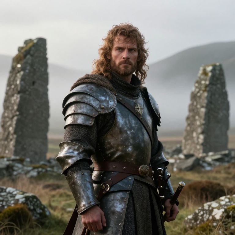 Macduff depicted as a heroic figure in a rugged Scottish landscape, morning fog swirling around ancient stone ruins, with ethereal light highlighting his focused eyes and weathered armor, digital art with dramatic realism and vibrant details