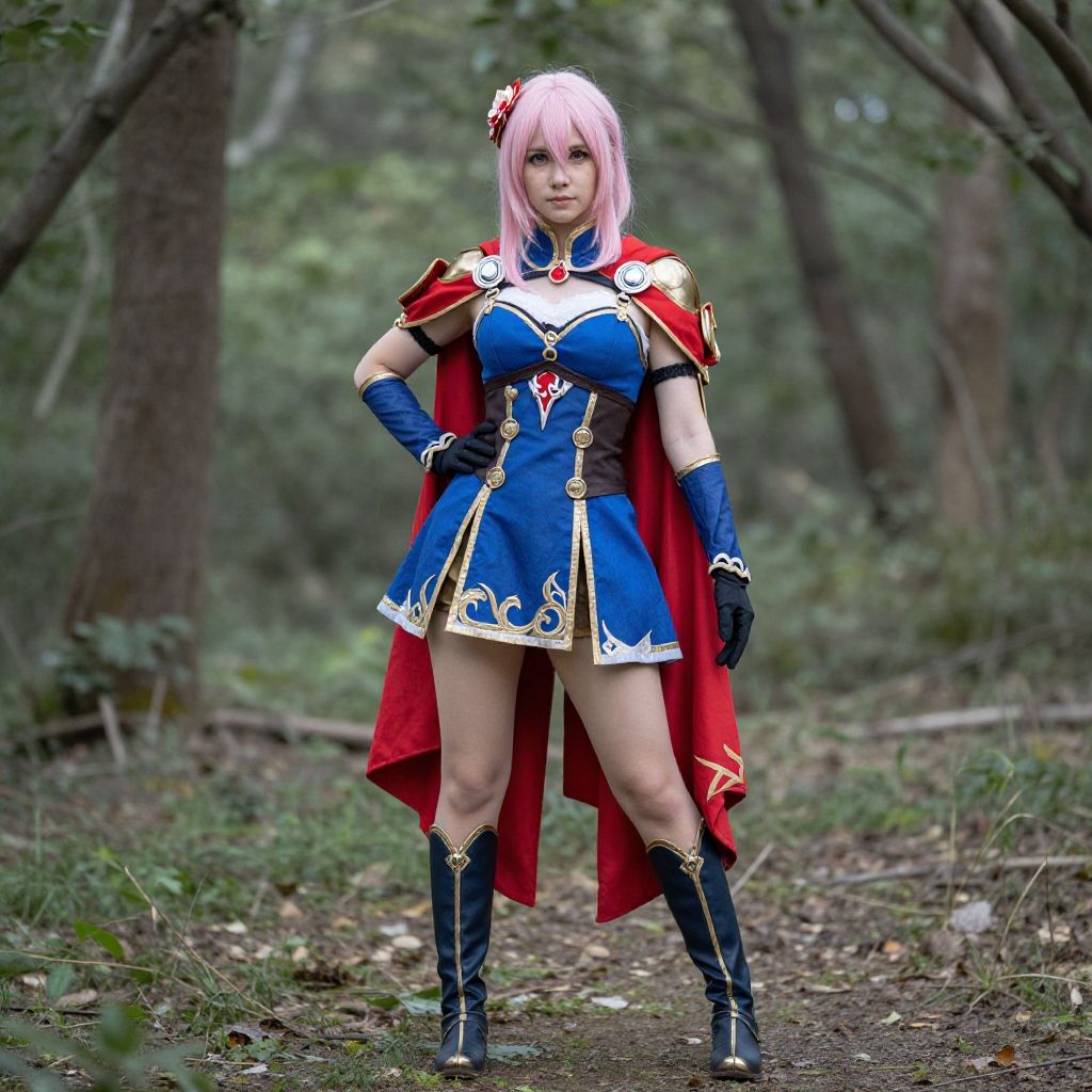 Photograph of a pink-haired woman in blue and gold fantasy armor, red cape, black gloves, and boots, standing confidently in a forest.