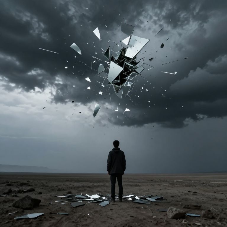 Amidst a desolate expanse, a solitary figure stands transfixed by a tempest of fractured truths, each shimmering shard a mirror to the chaos within, evoking a profound sense of existential disarray and the relentless pursuit of clarity.