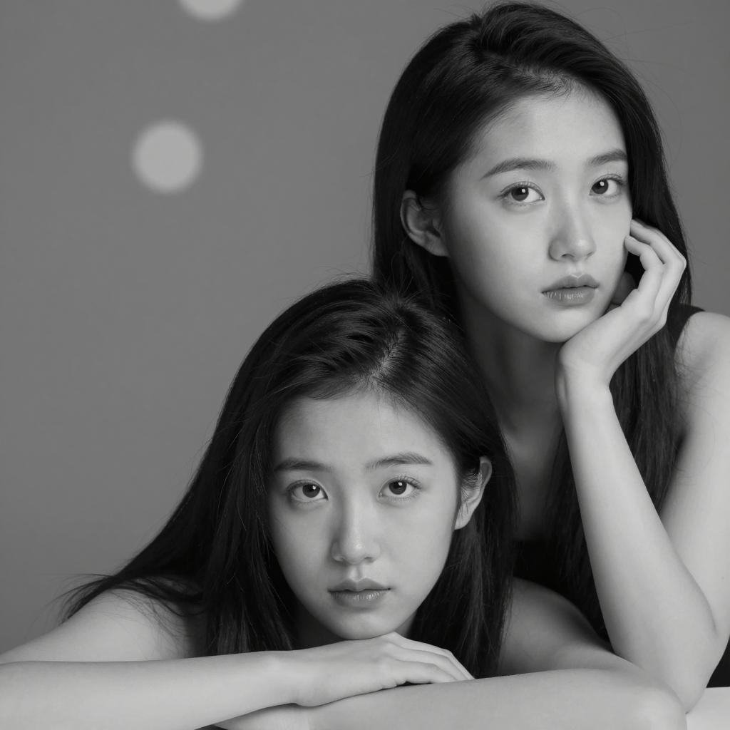 Black-and-white photograph of two women with long, straight hair. Front woman leans on hand, calm expression. Rear woman slightly turned, hand on cheek, soft expression. Background with bokeh lights. Women's faces centered, overlapping. Smooth hair ures, subtle shadows.