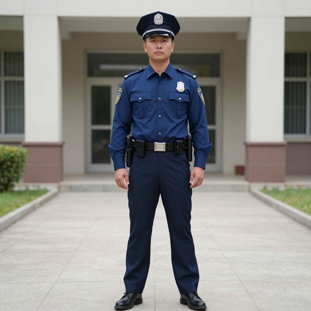 Photograph of a stern-looking male police officer standing on a concrete pathway in front of a building with white columns and large windows. He is wearing a dark blue uniform with a matching hat, badge, and name tag on his left chest. His uniform includes long sleeves, buttons, and a belt with a silver buckle. He has short, dark hair, and his hands are relaxed at his sides. The background features green shrubs on either side of the pathway and a beige building with pink lower trim. The image is well-lit and clear.