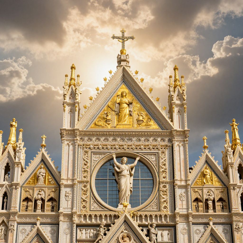 The image depicts a grand, gold and white cathedral in a medieval Italian setting, bathed in the ethereal glow of a heavenly atmosphere. The cathedral's facade is adorned with intricate carvings and statues, including a central figure of a woman with outstretched arms, flanked by angels with wings. Above, a golden cross stands prominently against the backdrop of a dramatic, cloud-filled sky, suggesting a divine presence. The statues, crafted with meticulous detail, appear to be descending from the heavens, adding a sense of awe and reverence to the scene. The overall composition is harmonious, with the cathedral's architectural elements and the celestial figures creating a balanced and visually striking image.