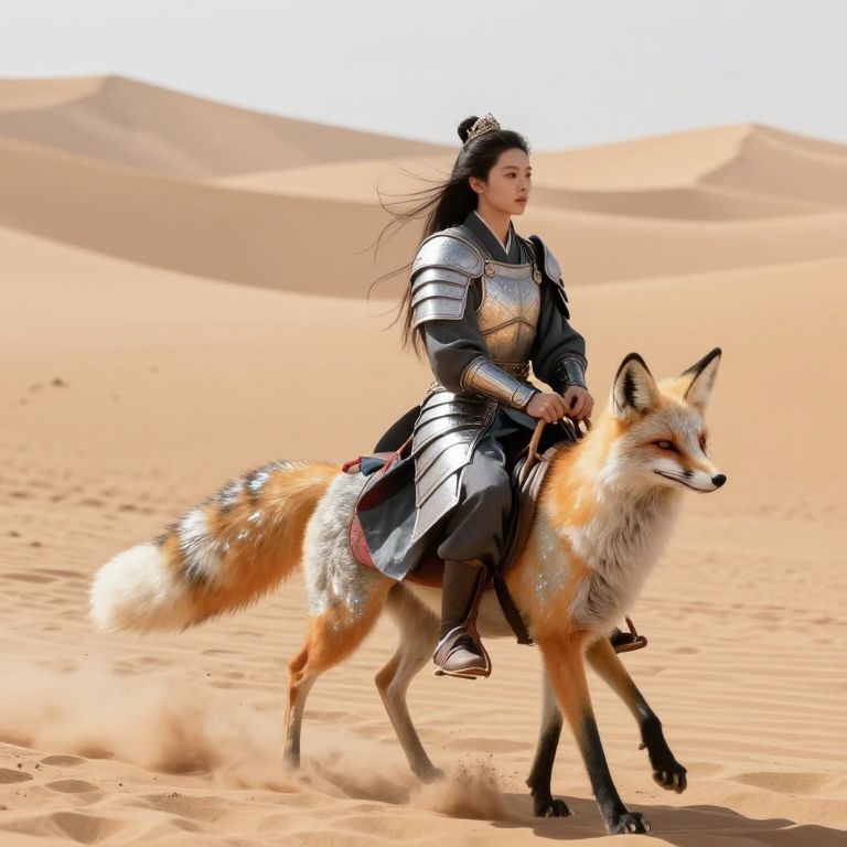 Digital artwork of an Asian woman in silver armor riding a red-orange fox through a sunlit desert with sand dunes.