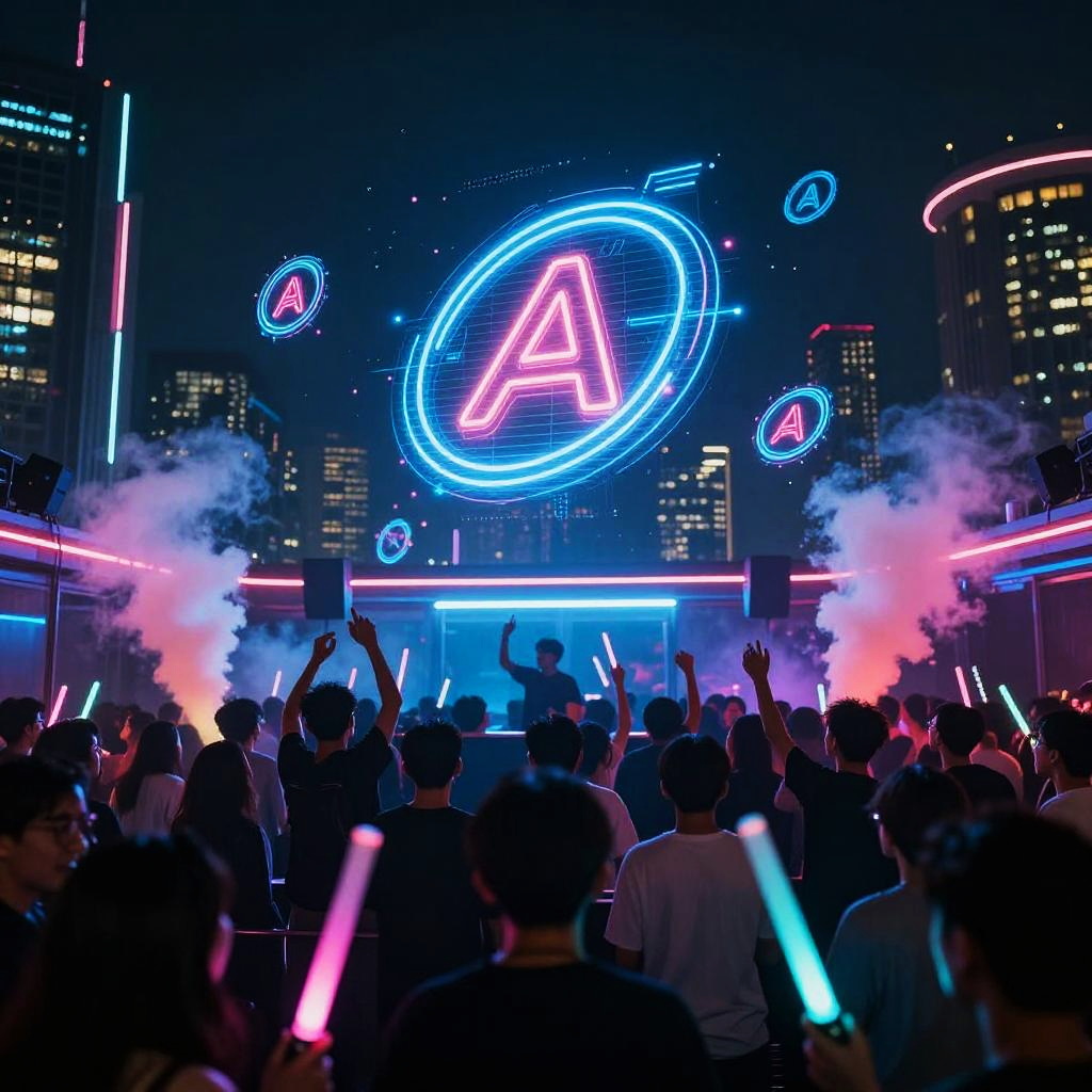 Rave signs illuminated with neon blues and pinks on a rooftop party at night, futuristic cyberpunk cityscape in the background, holographic symbols floating mid-air, energetic crowd celebrating with glow sticks and colorful smoke effects.