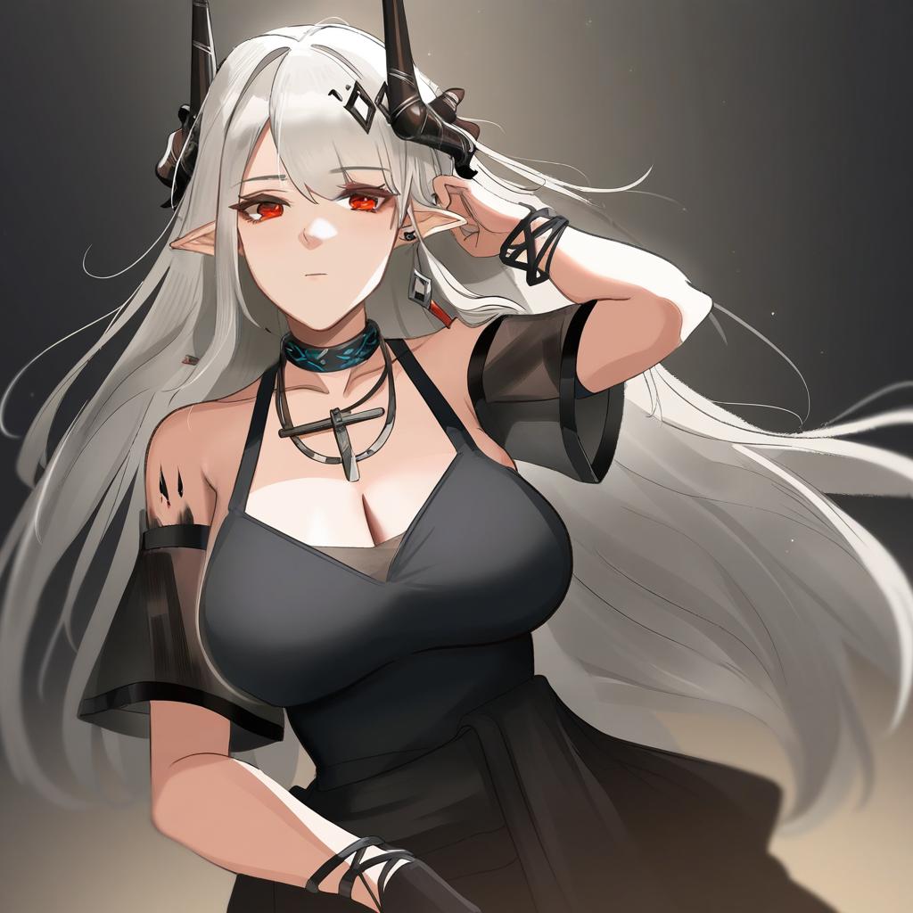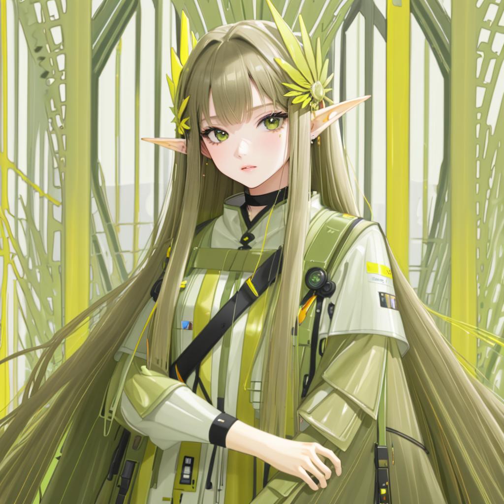 Muelsyse (arknights), arknights, 1girl, pointy ears, yellow eyes, mole under eye, very long hair, brown hair, long hair, long sleeves, black choker, elf, by artist norizc, leet