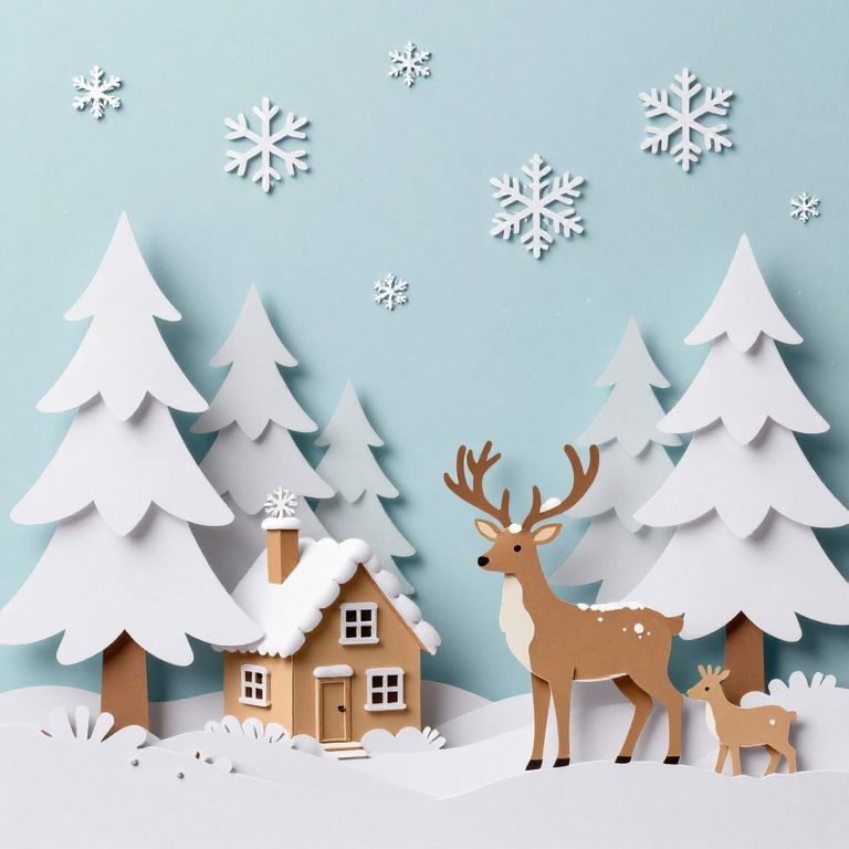 The image is a beautifully crafted papercraft illustration depicting a serene winter scene. The scene is dominated by tall, snow-covered evergreen trees, their branches heavy with white snow. Among the trees, a small, quaint house with a chimney and a snowflake on its roof sits nestled in the landscape. A majestic deer stands near the house, its antlers adorned with snow, while a smaller deer grazes nearby. The sky is dotted with large, intricate snowflakes, adding to the wintry atmosphere. The overall composition is harmonious, with the trees, house, and deer arranged in a balanced manner, creating a sense of tranquility and wonder typical of a Christmas setting.