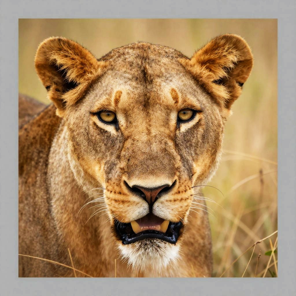 Photograph of a young lioness with golden-brown fur, alert and sitting in a sunlit, yellow grassy field, framed by a gray