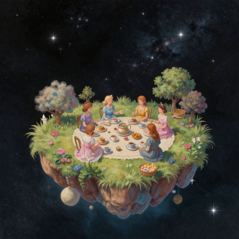 A whimsical digital artwork depicting an enchanting tea party among floating islands in an expansive, starlit cosmos. The setting captures the dreamlike essence of familiar objects existing in unexpected contexts, inviting viewers to explore the hidden beauty within the universe's vast expanse. Guests at this celestial gathering include anthropomorphic creatures from beloved fairy tales - a daring Red Riding Hood, a sagacious Bluebeard, and an inquisitive Little Prince. Each figure is rendered with imaginative, otherworldly elements that seamlessly blend their folklore origins with cosmic wonder, dressed in their signature attire yet adorned with fantastical embellishments. Against the backdrop of swirling galaxies and nebulae, they engage in lively conversation under softly glowing trees, whose leaves shimmer like stardust. The scene evokes a sense of enchantment, curiosity, and tranquility as it captures the ethereal essence of a surreal gathering where anthropomorphic characters from popular fairy tales socialize against the backdrop of celestial wonders.
