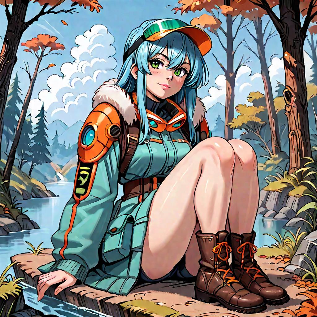 Score_9, score_8_up, score_7_up, score_6_up, score_5_up, score_4_up, source_anime, rating_safe, Josette Capua, blue hair, long hair, green eyes, medium breasts, visor cap, goggles around neck, green jacket, fur trim, shoulder armor, pauldron, orange miniskirt, boots, , looking at viewer, smile, full body, sitting, (yokozuwari), momo_no_sukebe, 1girl, overlooking distant mountains, distant river, (pine forest), autumn colors, sky, clouds, intricate, detailed background