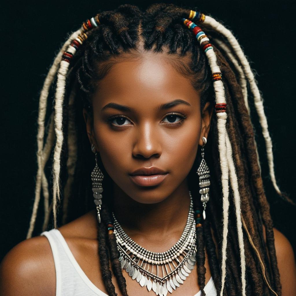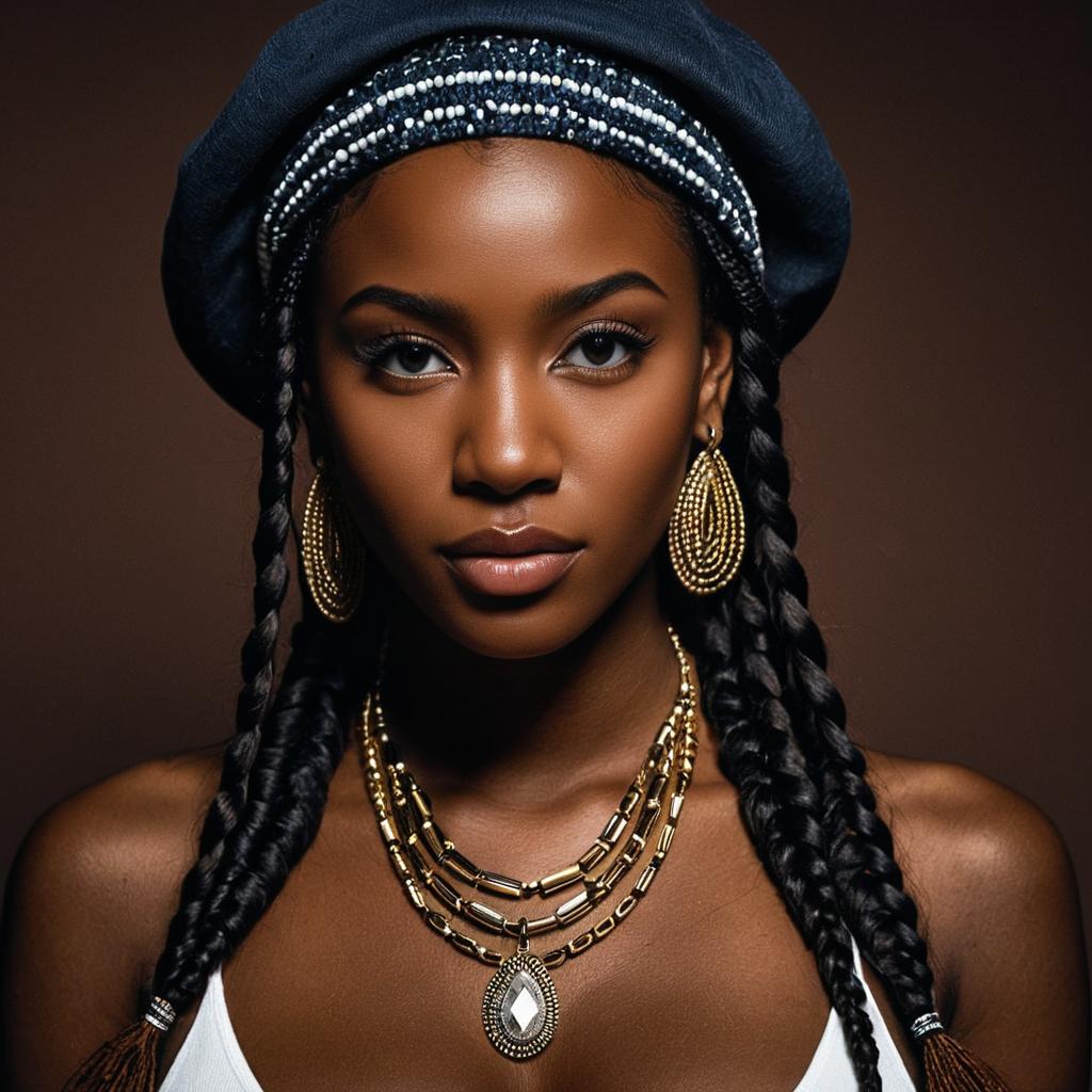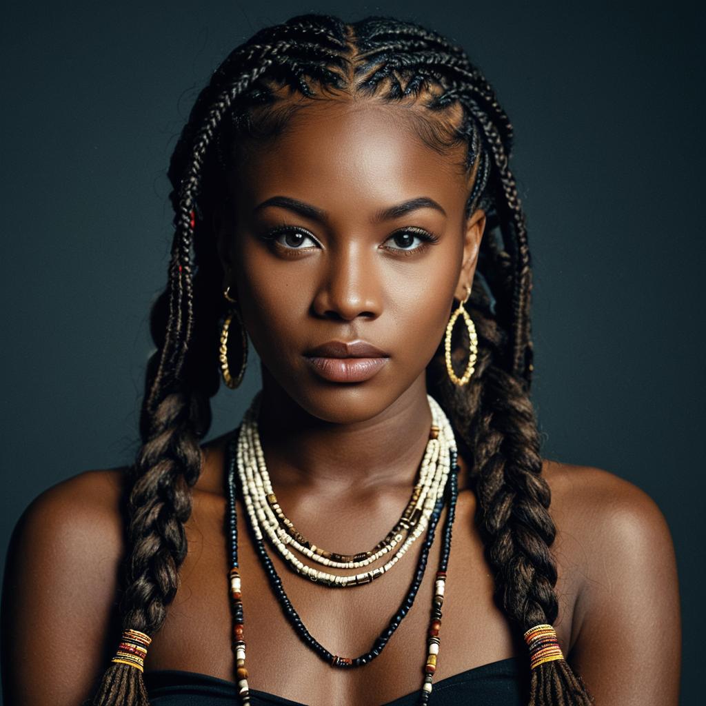 Short knotless braids beads,1girl, solo, jewelry, necklace, dreadlocks, realistic, looking at viewer, dark skin, dark-skinned female, long hair, strapless, lips, very dark skin, upper body, multiple braids, forehead, bare shoulders, brown hair