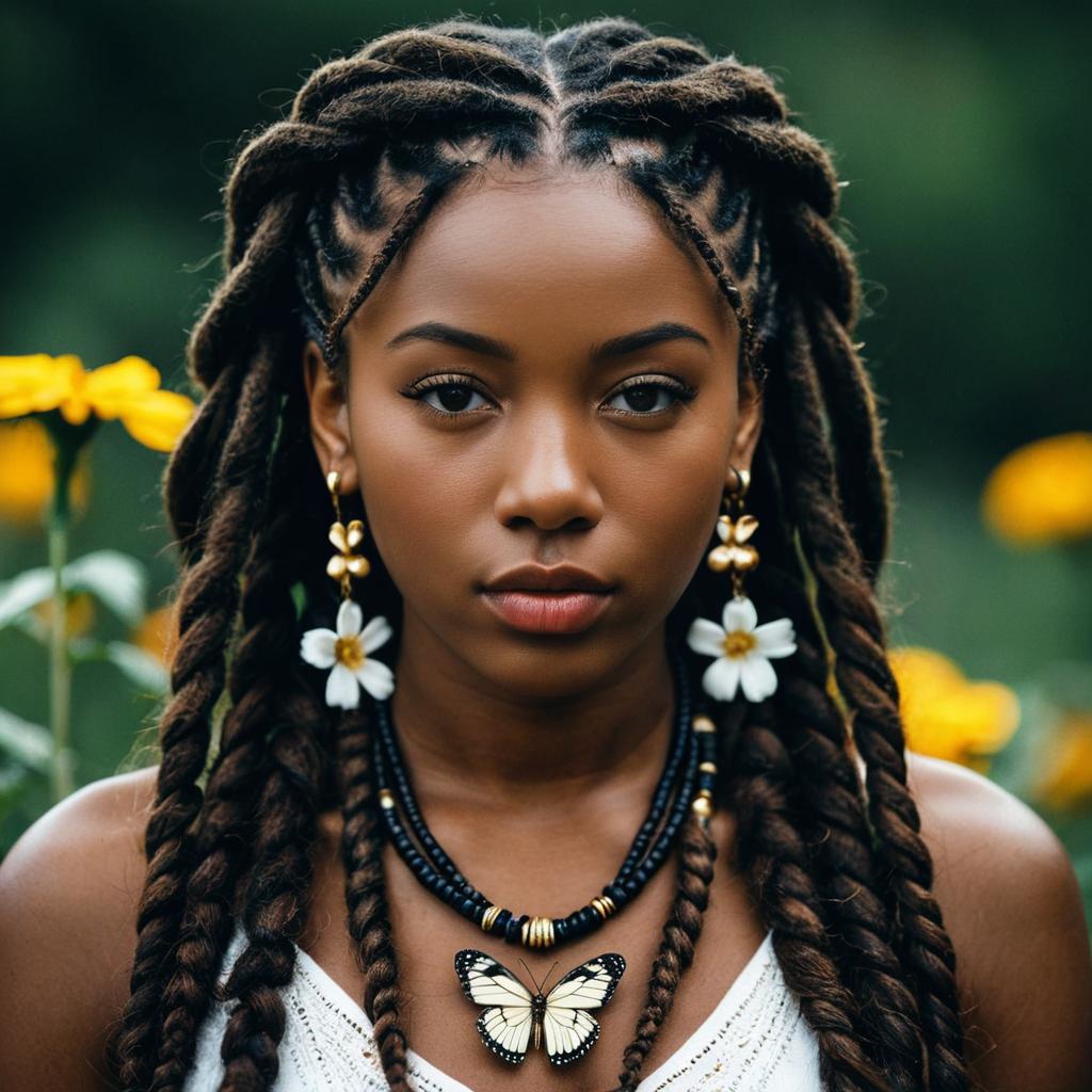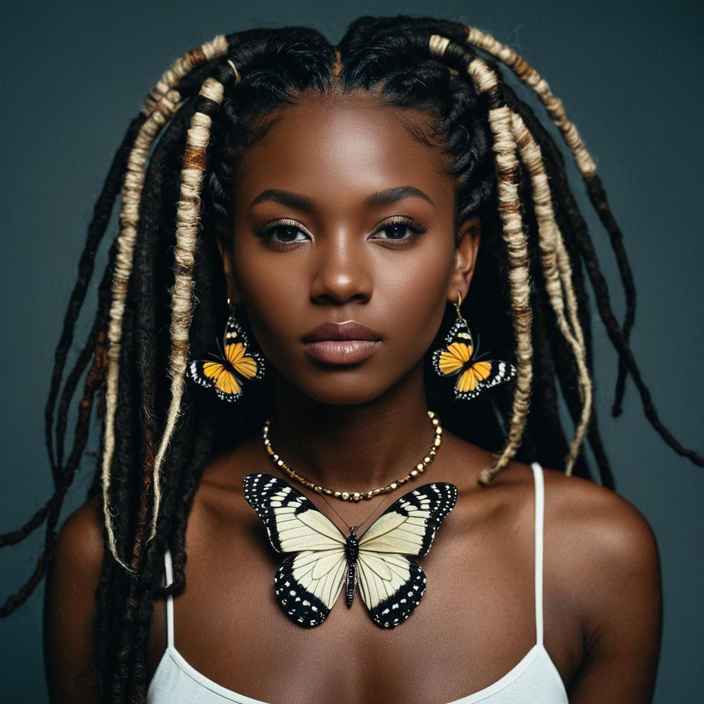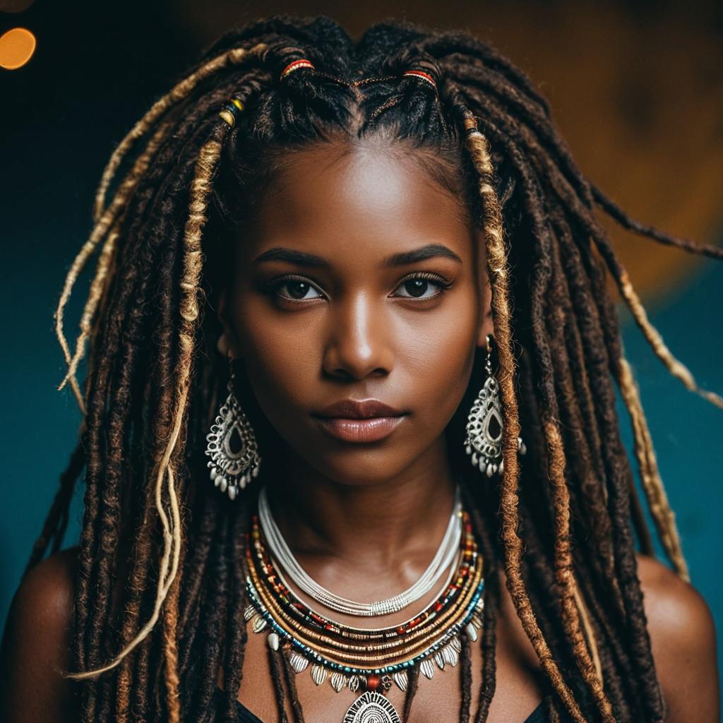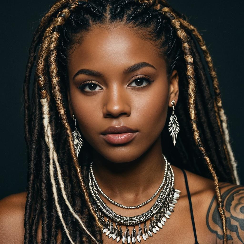 Short knotless braids beads,1girl, solo, jewelry, necklace, dreadlocks, realistic, looking at viewer, dark skin, dark-skinned female, long hair, strapless, lips, very dark skin, upper body, multiple braids, forehead, bare shoulders, brown hair