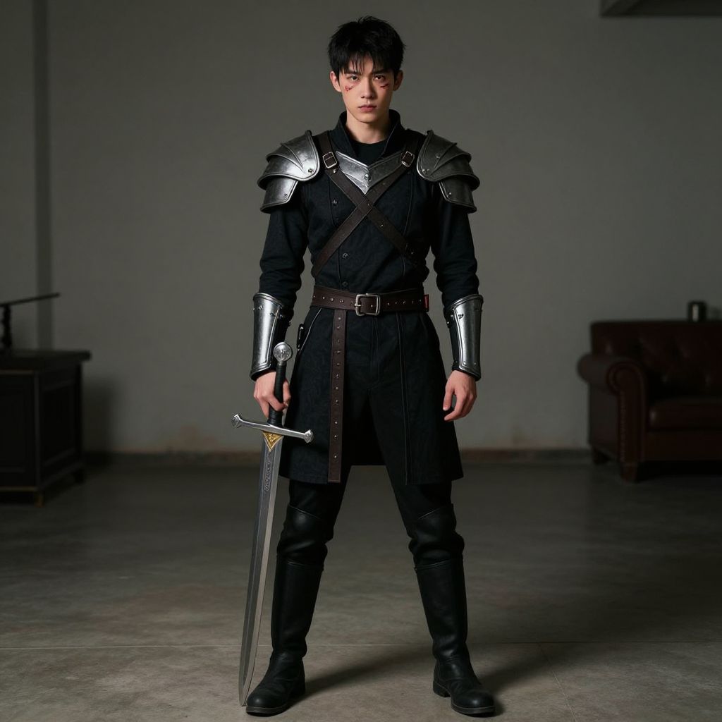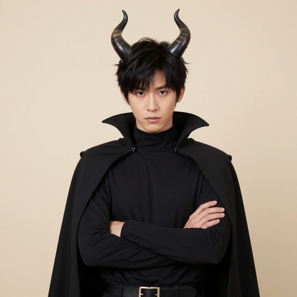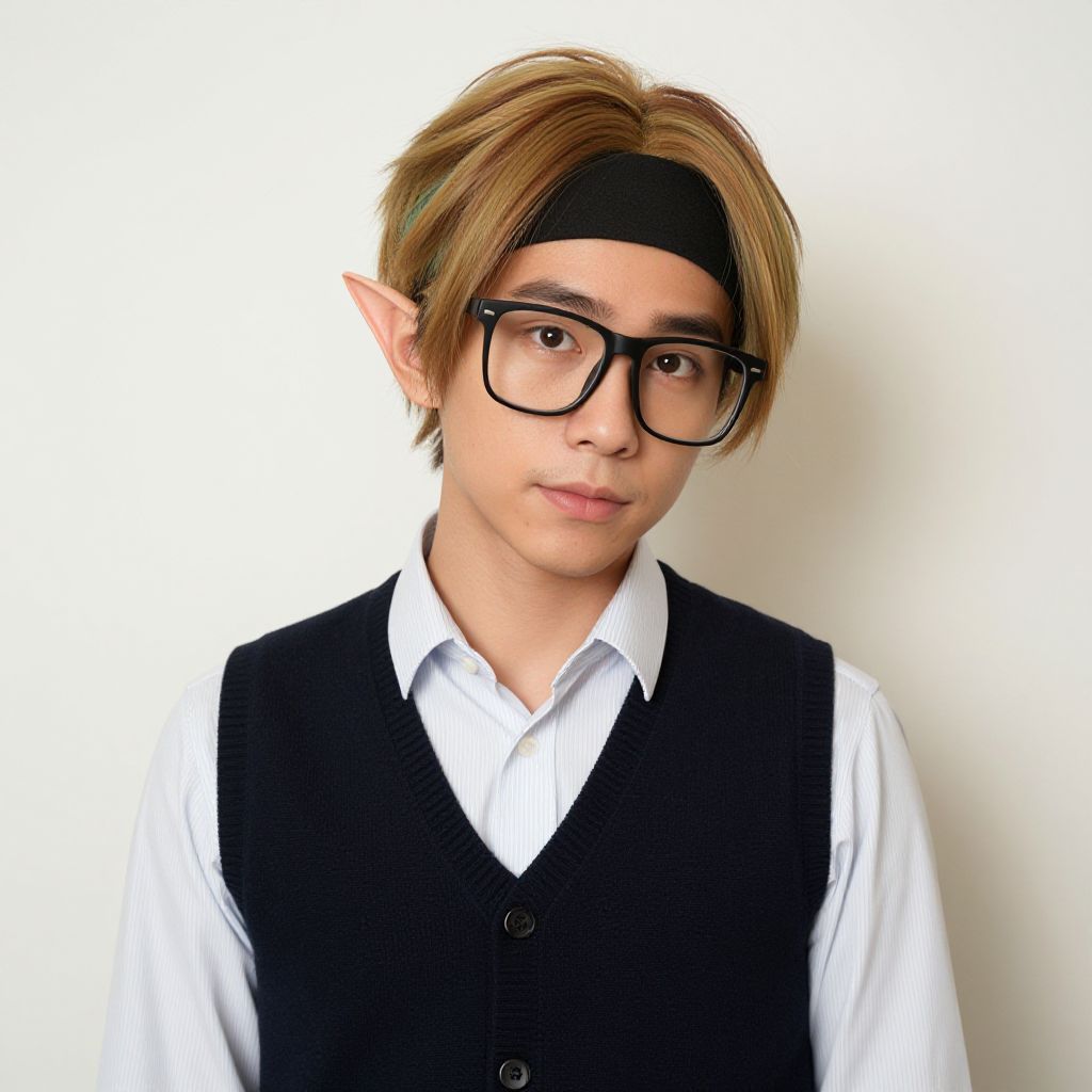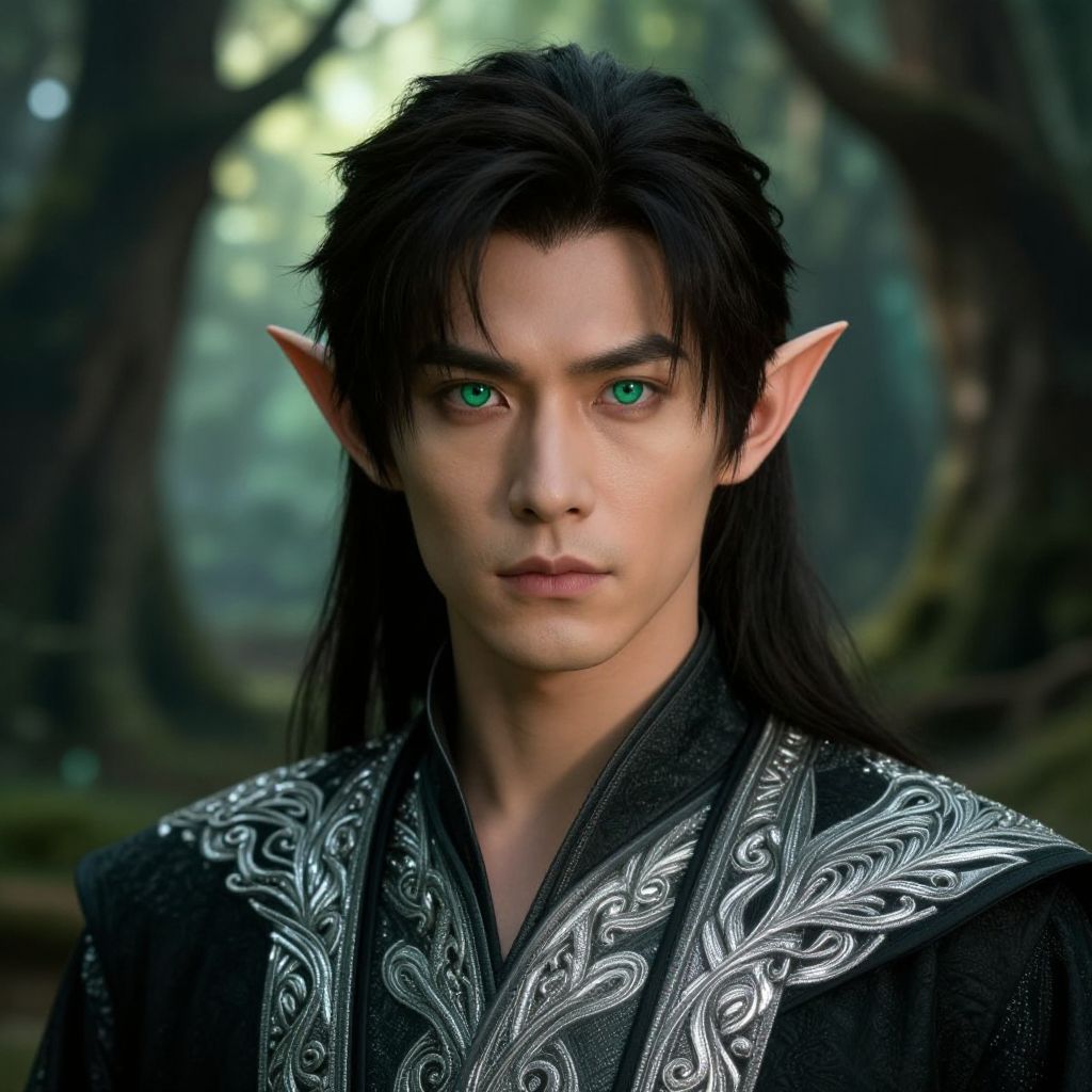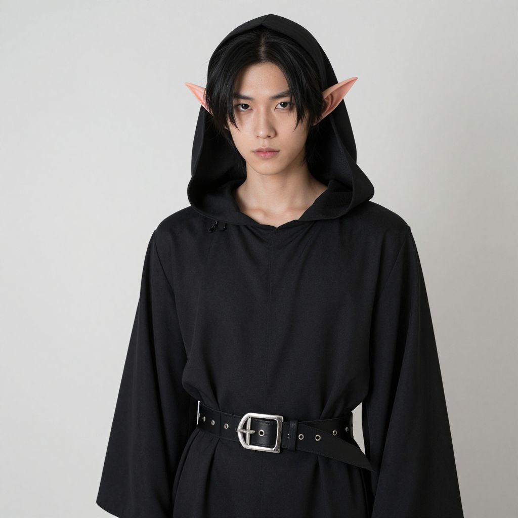 Photograph of an androgynous Asian person with pale skin, black hair, elf ears, wearing a black hooded robe and belt, against
