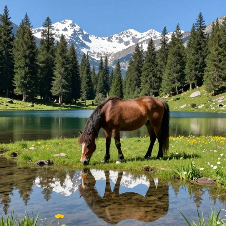 Hafling horse grazing peacefully by a clear mountain lake, reflecting the detailed horse image and lush pine trees, crystal clear water, vibrant green grass and blooming wildflowers, majestic snowy peaks in the distance under a bright blue sky