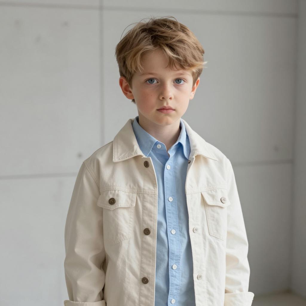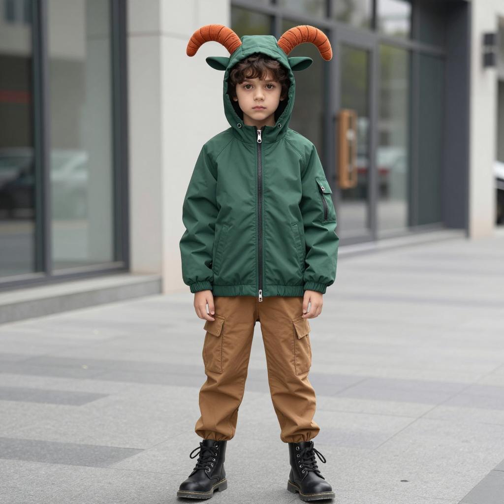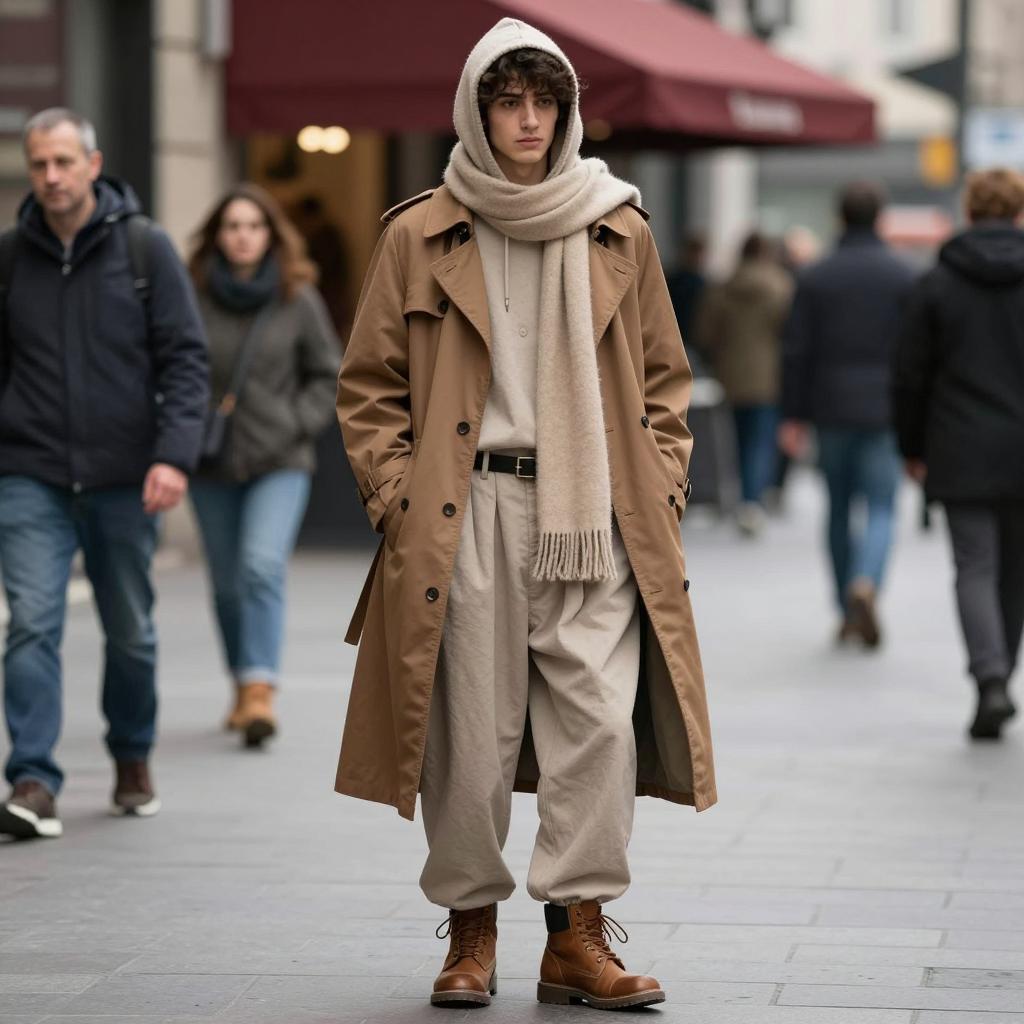 Boutiques costume, photorealistic, young boy standing in urban corridor, hands in pockets, brown two-toned hair, wearing green hoodie, brown scarf, long brown and tan coat with fur cuffs, tan skinny pants, black lace-up boots, natural light, shadows, modern city background, realistic ures, casual style, confident expression, daytime, street fashion, winter outfit, detailed clothing, high-quality photography, realistic lighting