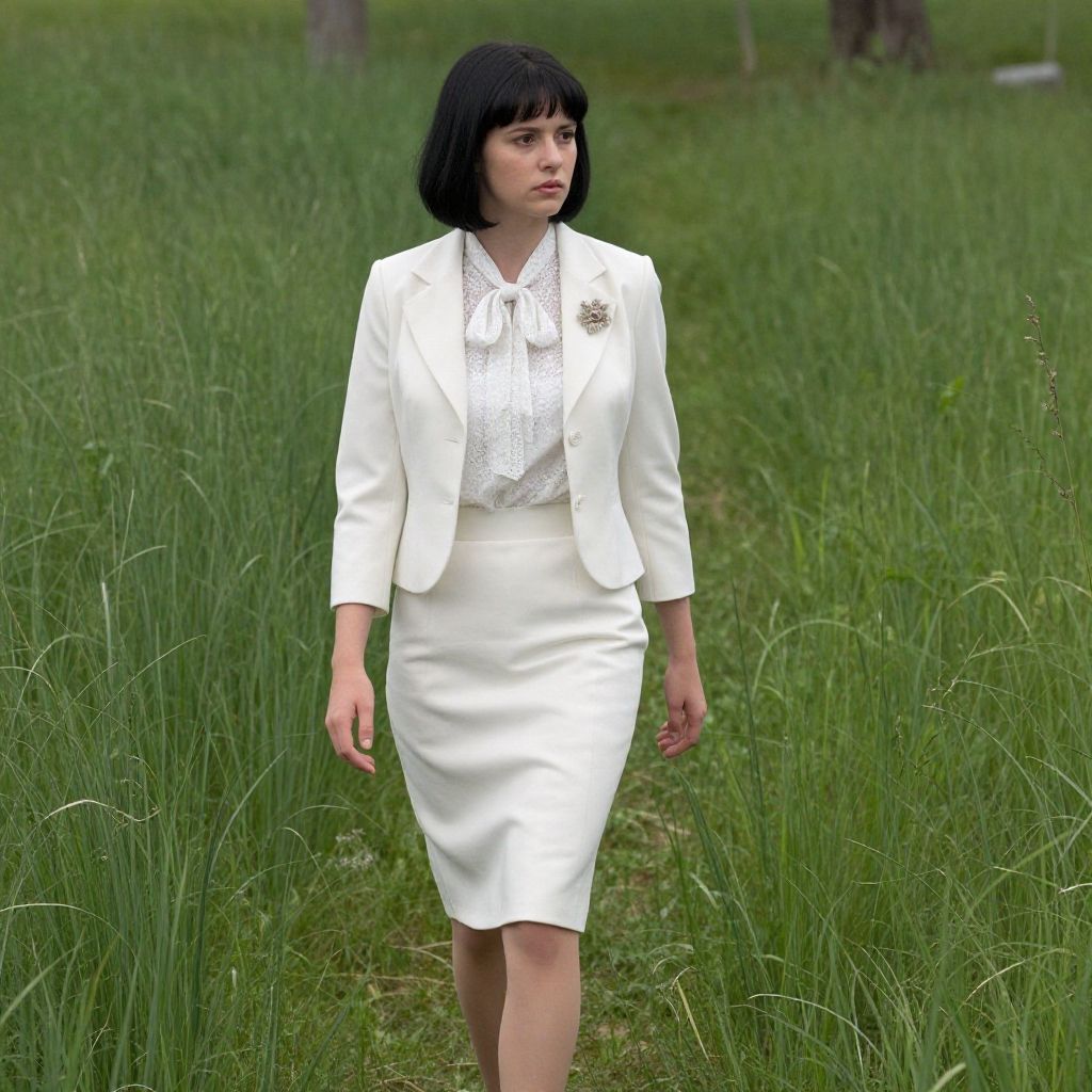 Photograph of a young woman with fair skin and straight black bob haircut, standing in a grassy field. She wears a white blazer over a white lace blouse and a white knee-length pencil skirt. A small flower pin adorns her left lapel. She walks through tall green grass, with trees in the background. Her expression is neutral, and she gazes slightly to the left. The image has a realistic, slightly soft-focus style, emphasizing the contrast between her white outfit and the green surroundings.