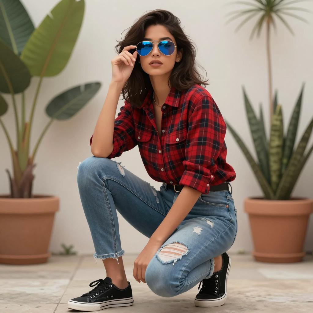 Full body digital illustration of a young woman with dark hair and blue-tinted aviator sunglasses. She is wearing a red plaid button-down shirt with roll-tab sleeves paired with distressed slim fit denim jeans. The woman is casually squatting outdoors near potted plants, showcasing a relaxed and stylish look.