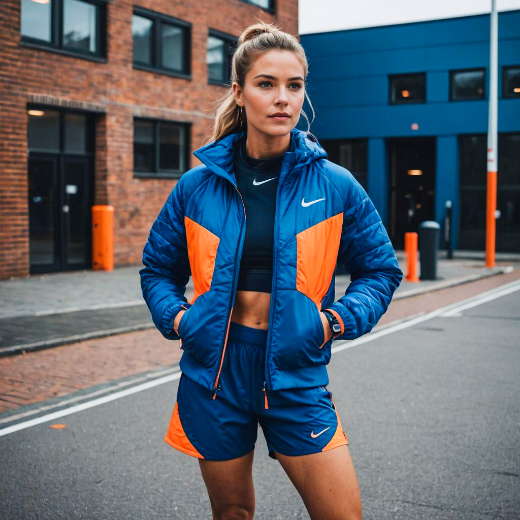 Nike outfit, worn by a fitness model, featuring Nike quilted jacket and running shorts, in blue and orange.