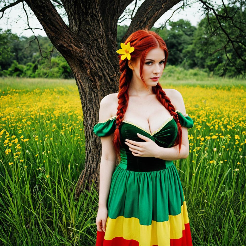 Portrait of a young woman with long red hair wearing a green sequined strapless dress. She has fair skin, blue eyes, and is looking directly at the camera. The background is blurred green foliage, creating a natural outdoor setting.