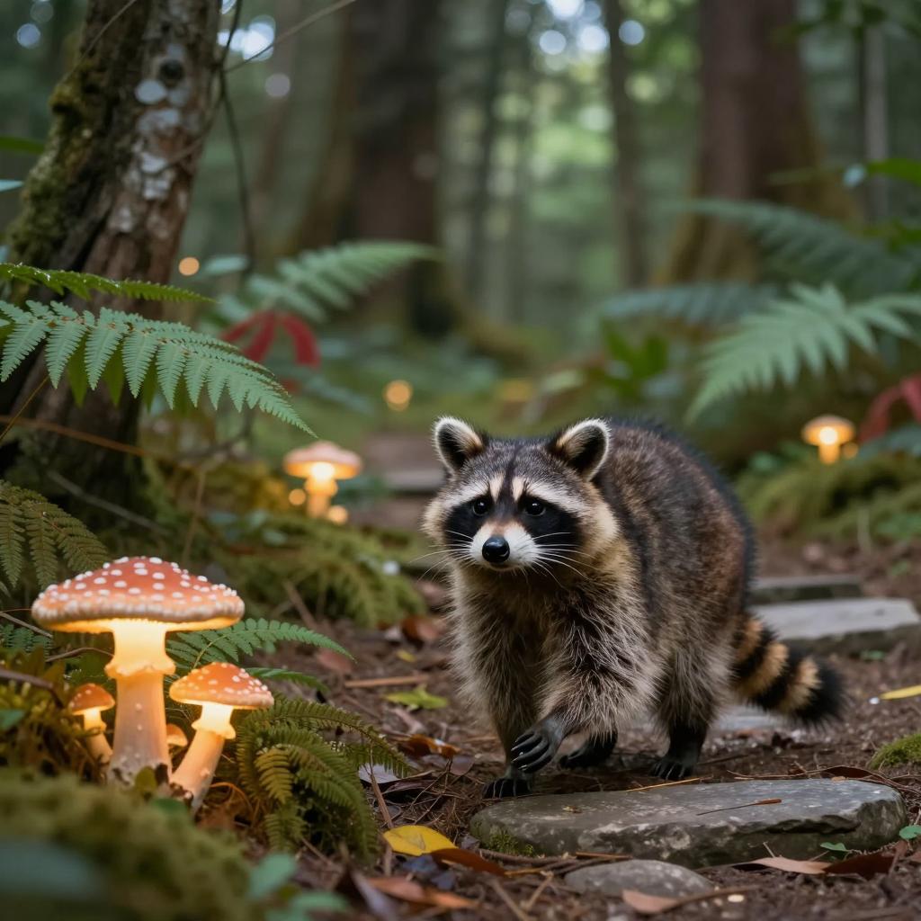 A raccoon walking along a stone pathway in a dense forest, surrounded by glowing orange and white spotted mushrooms (likely Amanita muscaria) and lush green ferns. Soft, diffused lighting enhances the vibrant colors and creates a mystical atmosphere in this serene woodland setting.