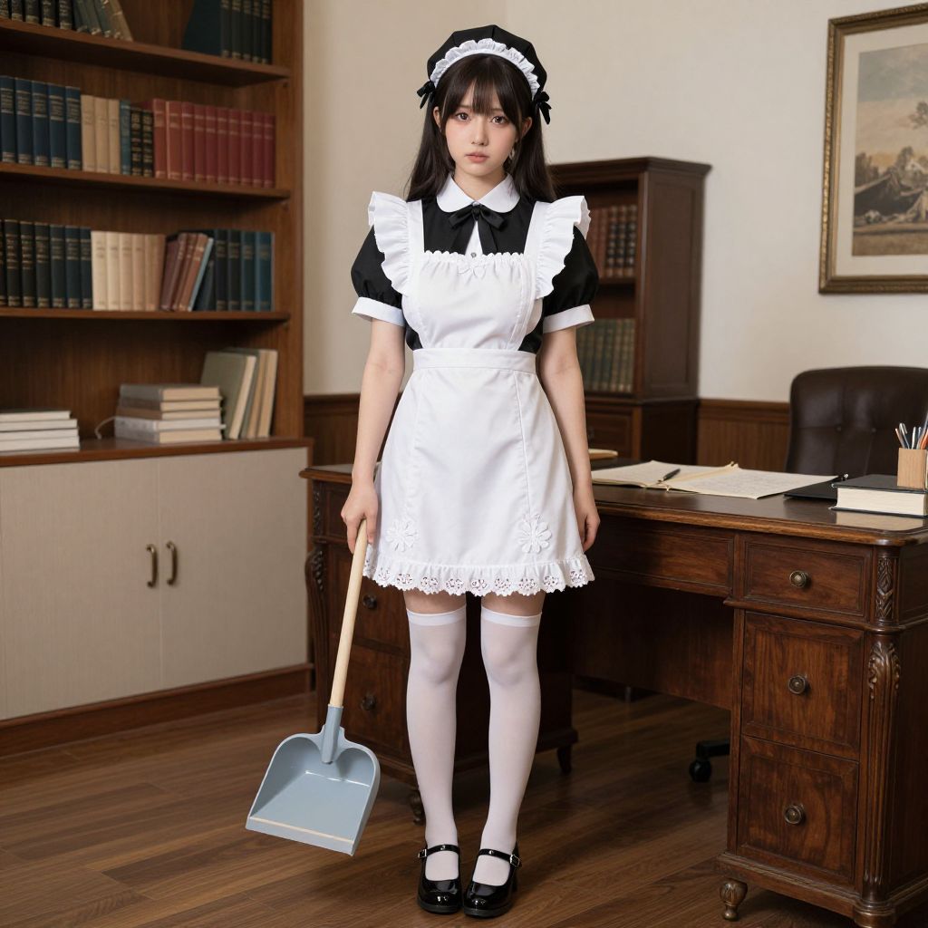 Photograph of an Asian woman with long black hair and bangs, wearing a traditional black and white French maid outfit with a lace trim, white apron, black shoes, and white thigh-high stockings. She holds a gray dustpan in her right hand. She stands in a dimly lit library-like room with wooden floors, bookshelves filled with books, and a wooden desk with papers and a framed painting on the wall. The maid's expression is neutral, and she is centered in the image. The room has a classic, slightly vintage feel.