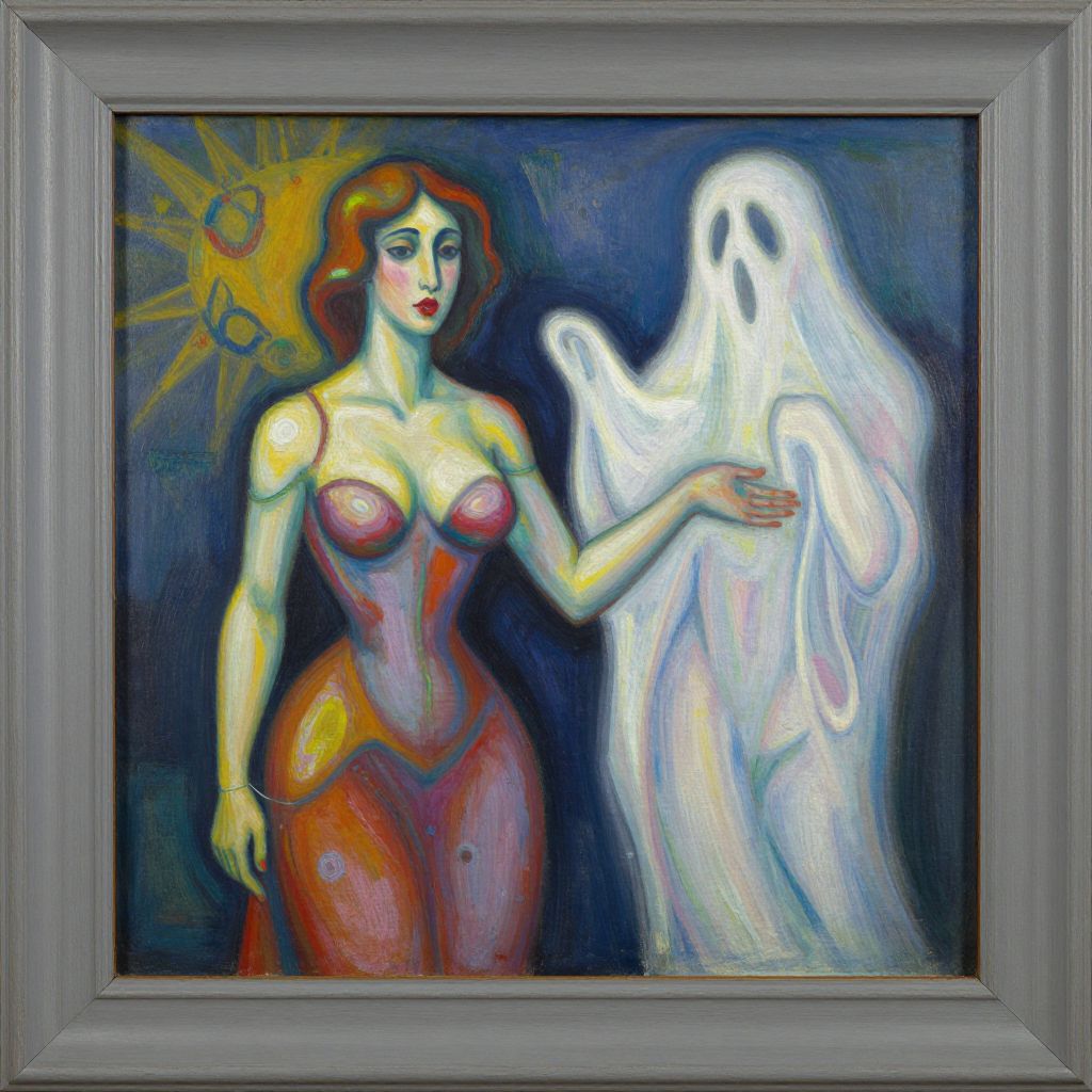 This is a colorful, impressionistic painting depicting a woman with red hair, fair skin, and red lipstick, wearing a tight, strapless, pink and orange dress that highlights her large breasts. She stands beside a glowing, translucent ghost with white, featureless eyes and arms. The background is dark blue with a yellow, sun-like shape on the left. The woman's left arm rests on the ghost's shoulder. The painting is framed in a gray wooden frame and uses thick, expressive brushstrokes. The ghost's ethereal glow contrasts with the woman's solid form, creating a surreal, mystical atmosphere.