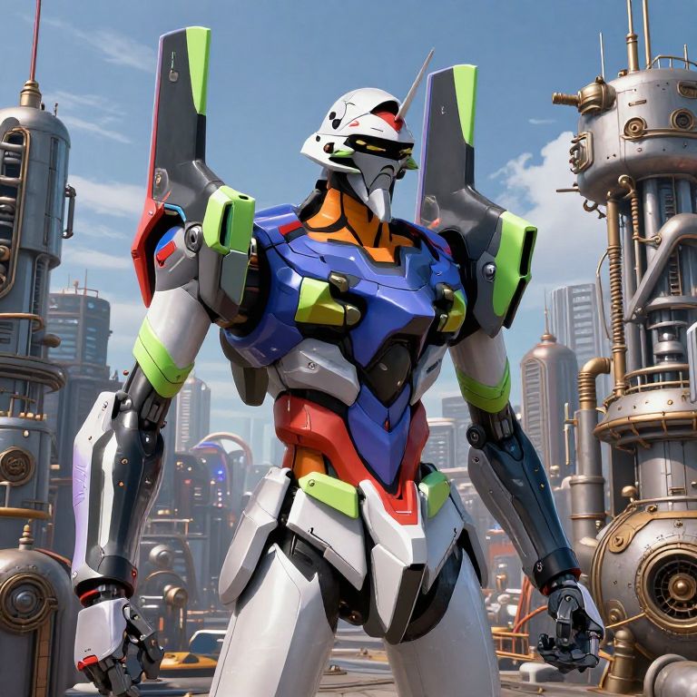 Digital artwork of a humanoid robot standing in a futuristic cityscape. The robot has a white helmet with a black visor, and its body is segmented with vibrant colors: blue chest, red lower torso, green shoulder pads, and white limbs. It has neon green accents and angular, armor-like plating. The background features towering buildings and intricate, metallic industrial structures with pipes and gears. The sky is clear with a few clouds, and the overall style is reminiscent of sci-fi anime with sharp lines and bright, contrasting colors. The robot's stance is strong and imposing.