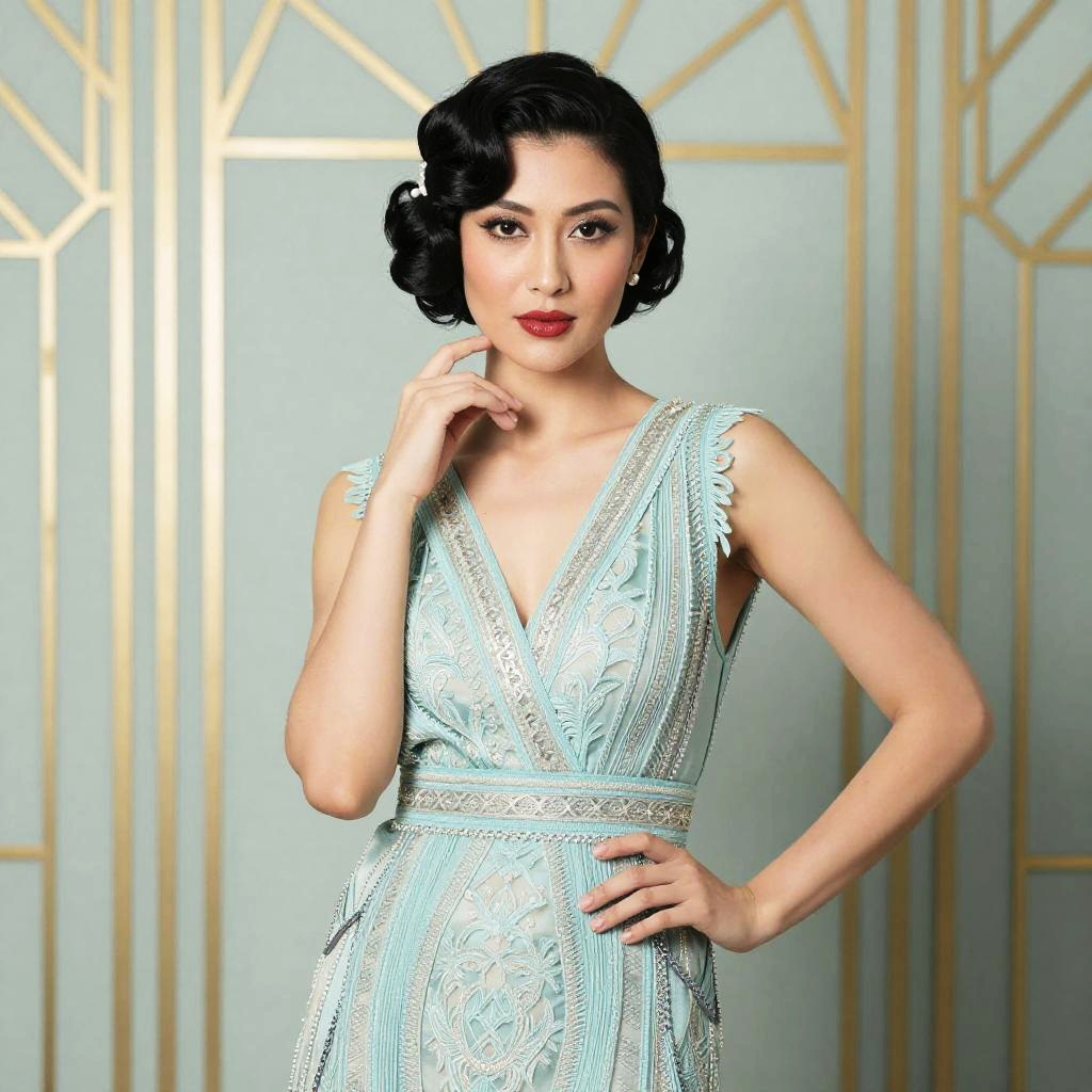 Fair skin black hair vintage-inspired fashion model in 1920s flapper dress, art deco background, soft pastel color palette, high contrast photography style
