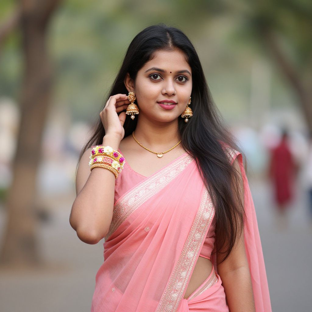 Photograph of a young Indian woman with long, straight black hair, wearing a pink saree with gold trim, and traditional gold jewelry including earrings, a necklace, and bangles. She has medium brown skin and is smiling slightly while touching her hair with her right hand. The background is a blurred outdoor setting with trees and a few indistinct figures, suggesting a park or street. The image has a soft, natural light, highlighting her elegant and traditional attire.