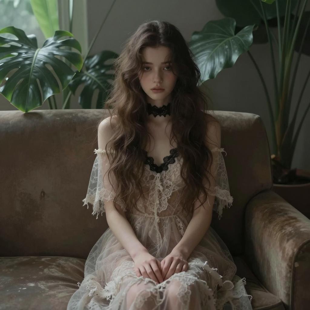 Young Woman in Lace Dress Sitting on Ornate Chair