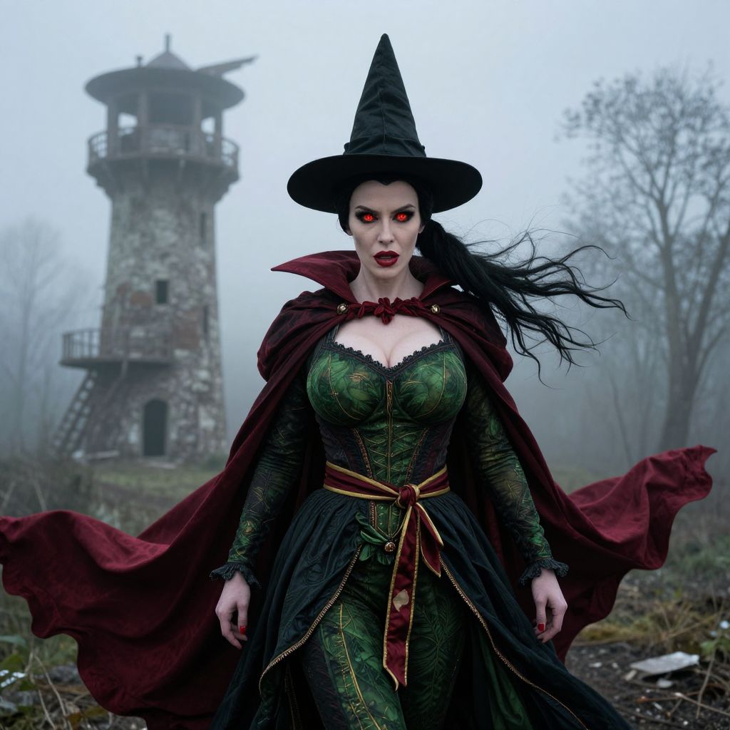 A dramatic photo of a woman in a classic wicked witch north costume, with green and red tones, glowing red eyes, and a wide sash, standing in a fog-covered abandoned tower in a northern forest, her face sharp and intense, with big breasts prominent under the layered costume, the wind blowing her cloak dramatically. The woman has big tits and cute face