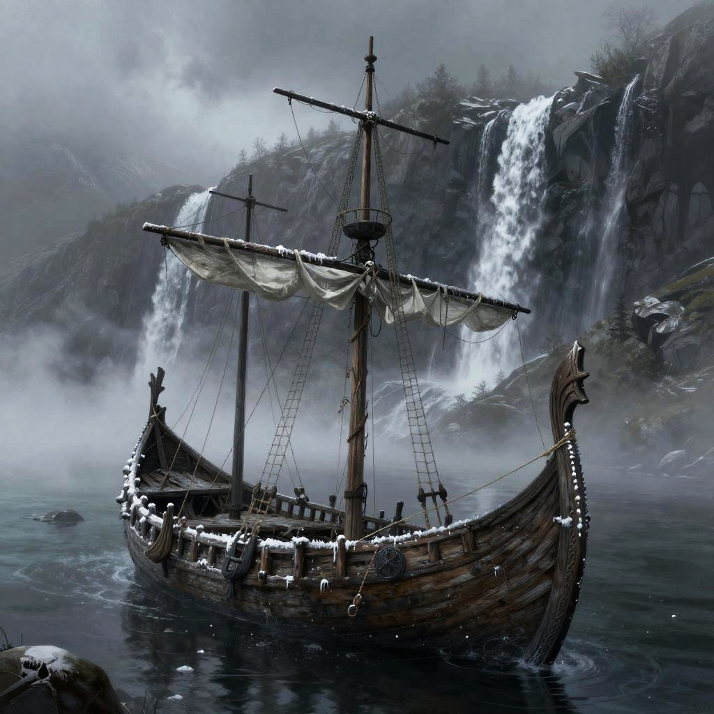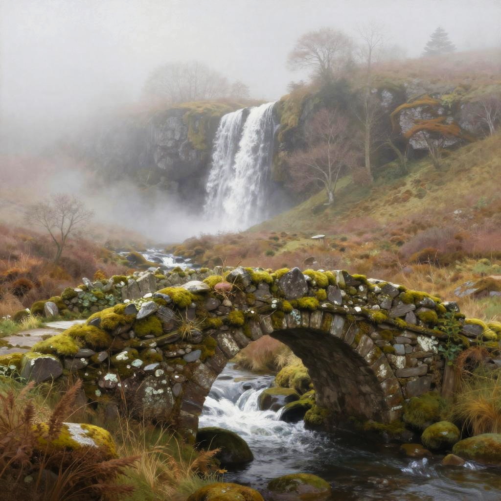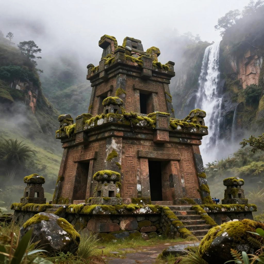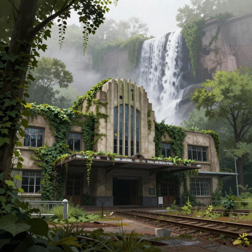 Ultra‑detailed digital painting of derelict gothic cathedral overtaken by lush vines in a mist‑shrouded gloomy cliffside ravine, cascading waterfalls in the background, rendered in dark fantasy illustration with heavy chiaroscuro