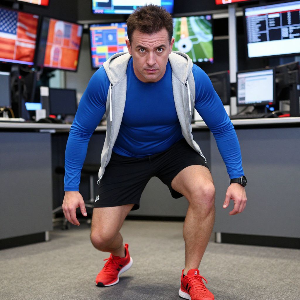 A man, athletic shorts in black, fitted long-sleeve performance shirt in royal blue, zippered hoodie in light gray, vibrant red running shoes, open trading floor, vibrant screens, intense focus, Holga camera style, determined expression Man has masculine face and piercing eyes