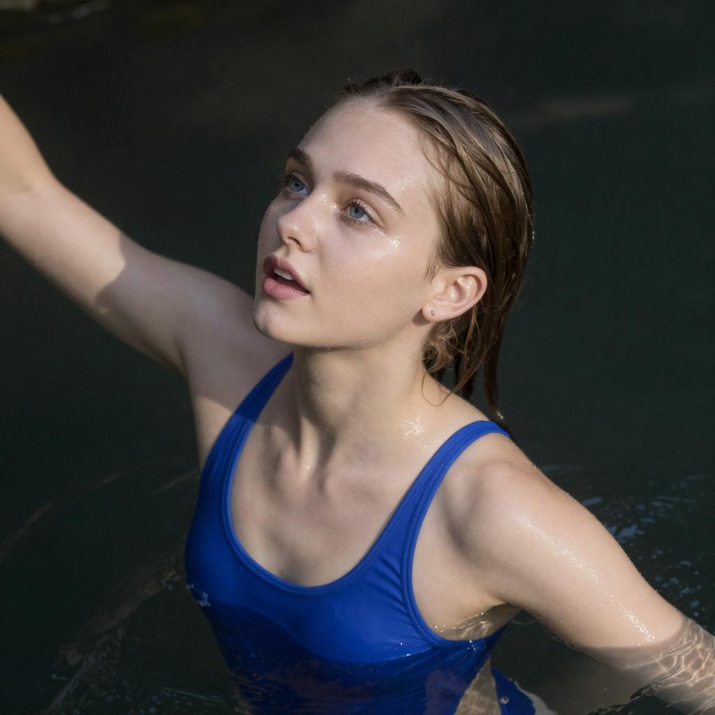 Photograph of a young woman with wet, light brown hair, blue eyes, and fair skin. She is swimming in dark water, wearing a blue swimsuit with visible straps. Her mouth is slightly open, and she looks upward. Her left arm is raised above the water. Sunlight glistens on her hair and skin.