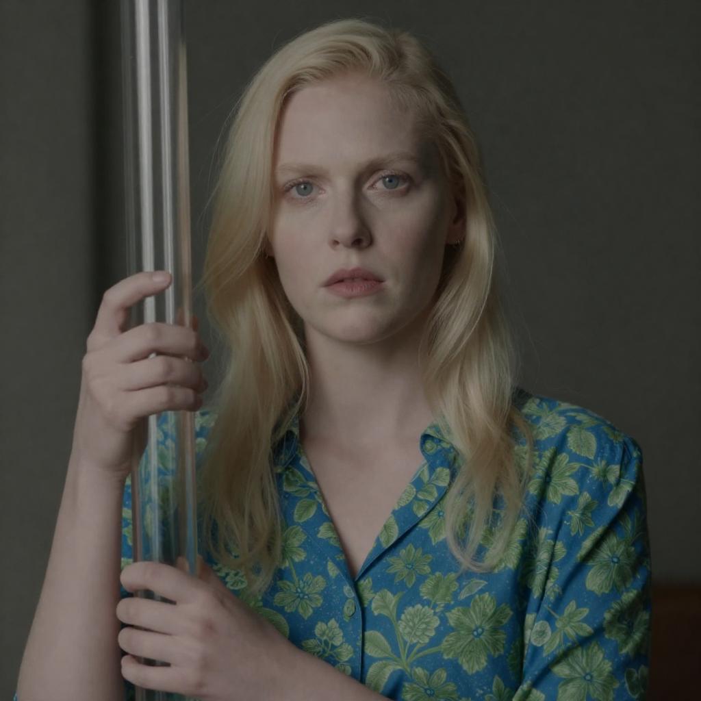 Photograph of a pale-skinned woman with wavy brown hair, wearing a yellow dress with intricate, swirling patterns on the chest. She stands against a dark, wooden background with a single, glowing light bulb to her right. Her expression is contemplative, and the lighting highlights her delicate features.