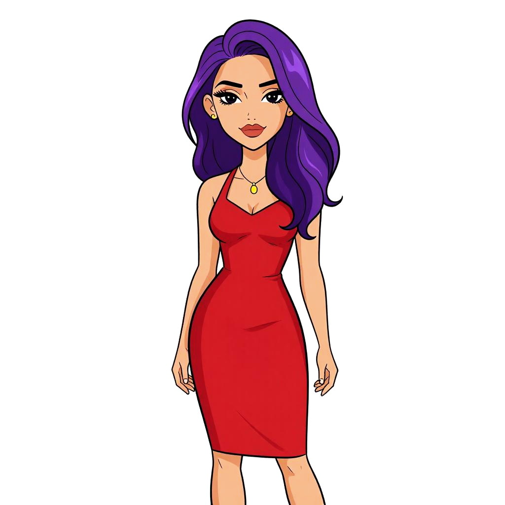 Woman with pretty face and pretty hair. Woman, casual chic, solid red halter neck dress, sleeveless, skater skirt silhouette, knee-length, delicate gold pendant necklace, white studio background. --sref 1467