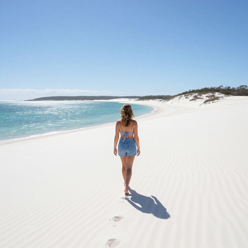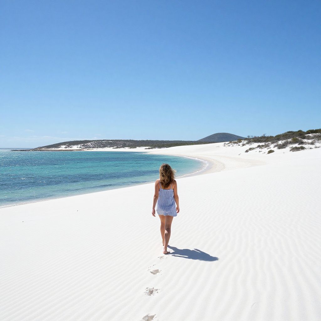 Woman walking barefoot along a pristine white sand dune under a clear blue sky, with the azure waters of Lucky Bay shimmering to her left and distant hills framing the horizon in Cape Le Grand National Park, Western Australia.