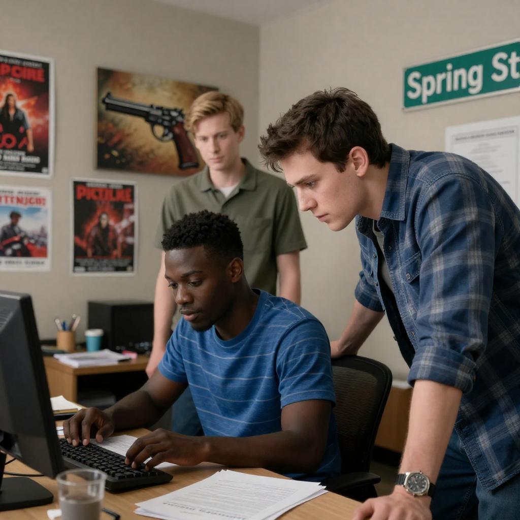 Photograph of two men in a modern setting. One man in a green jacket stands left, looking down. The other in a dark suit and white shirt stands right, opening a laptop on a bright counter. Metal grid background. Both men have short brown hair. The man in the suit looks at the other.