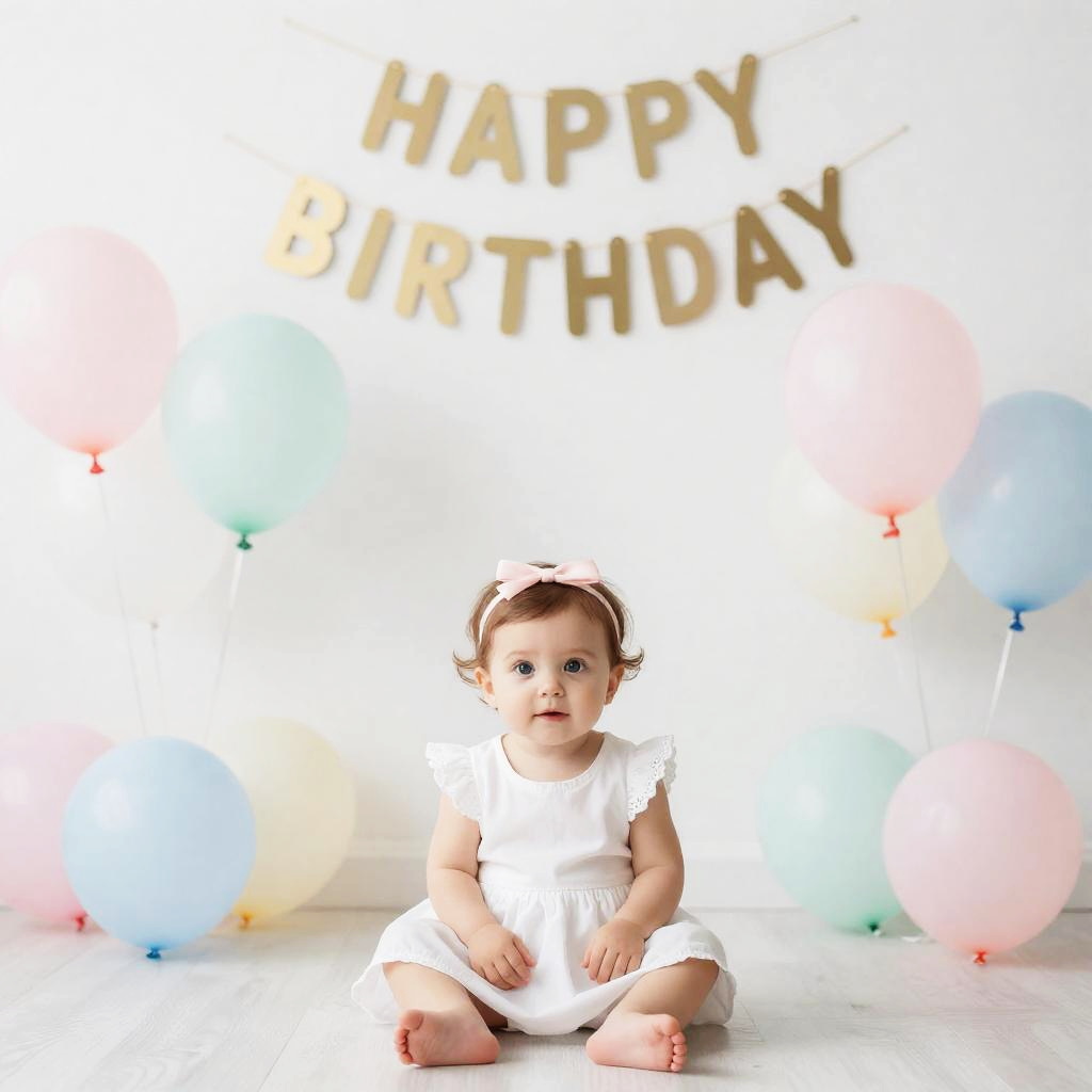Photograph of a baby with light skin and brown hair, wearing a white, short-sleeved onesie and a pink headband with a small bow. The baby sits on a white floor with legs spread apart, looking directly at the camera. Background features a white wall with "HAPPY BIRTHDAY" in gold, glittery letters. The wall is adorned with pastel-colored balloons in pink, blue, and yellow, some with small star stickers. The image is brightly lit, creating a cheerful and festive atmosphere.
