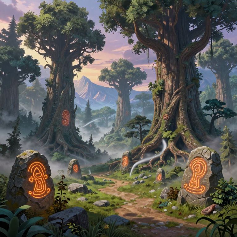 Fantastical forest scene with glowing rune-marked stones, towering ancient trees, misty mountains, and a vibrant, colorful sunset sky. Digital artwork