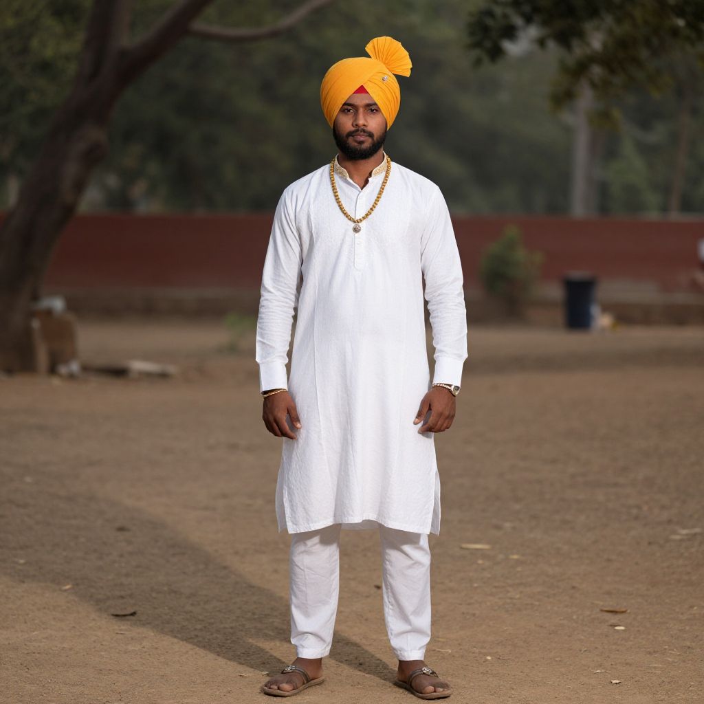 Indian national costume male, 1boy, male focus, solo, facial hair, beard, turban, standing, dark skin, full body, looking at viewer, necklace, dark-skinned male, jewelry
