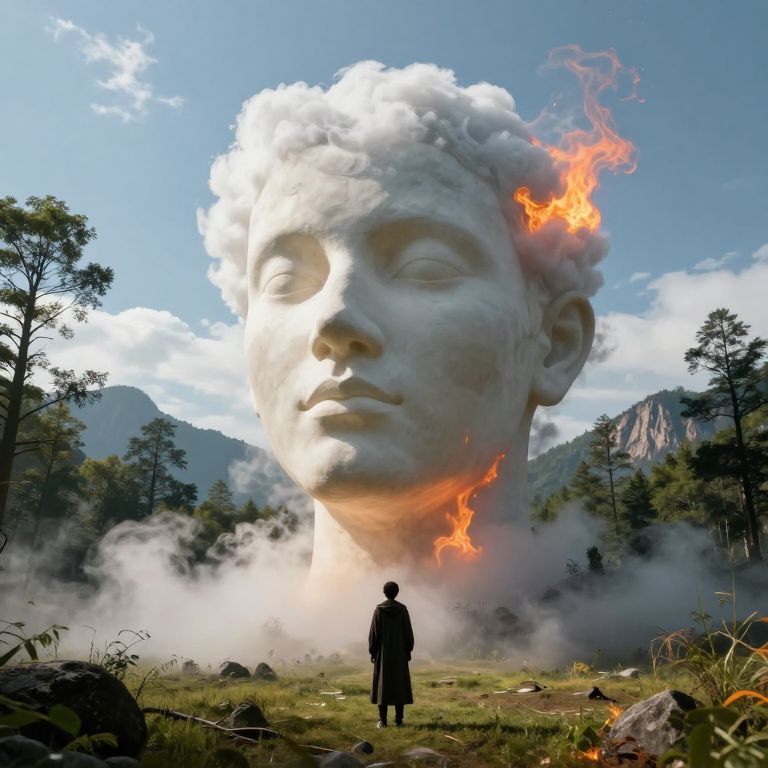 Photograph-like digital art depicting a colossal, white stone statue of a young boy's face, partially engulfed in bright orange flames and thick white smoke. The statue's serene expression contrasts with the fiery blaze. A lone figure, dressed in a long black coat, stands at the base, gazing upwards. The background features a clear blue sky, scattered clouds, and a forested landscape with tall trees and distant, rugged mountains. The ground is grassy with scattered rocks, adding a natural, untouched feel to the scene. The image blends realism with surrealism, emphasizing the dramatic size and mysterious nature of the statue.