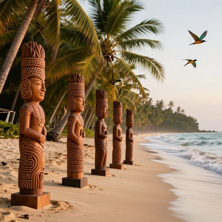 Photograph of a tropical beach at sunset. Tall, intricately carved wooden statues of human figures with detailed patterns and headdresses stand in a line along the sandy shore. Palm trees with green fronds lean over the statues from the left. The beach extends into the distance with gentle waves lapping the shore. Two colorful birds fly in the clear sky on the right. The statues, positioned evenly, lead the eye along the beach, which is lined with dense greenery in the background. The warm, golden sunlight casts long shadows.