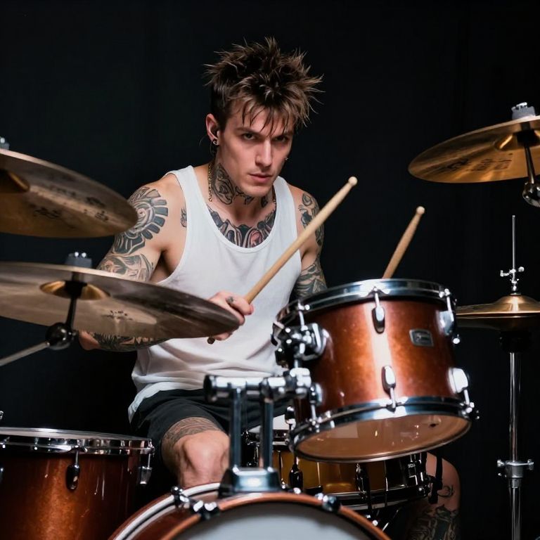 In the image, a tattooed drummer is captured in a dynamic pose, playing a drum set with intense focus. The drummer, wearing a white tank top adorned with intricate tattoos, is positioned centrally, with his body slightly angled towards the camera. His facial structure is hyper-realistic, with detailed features and expressive eyes. The drummer's hair is styled in a messy, spiky manner, adding to the edgy aesthetic. He holds drumsticks in his hands, poised to strike the drums, which are metallic and shiny, reflecting the light. The cymbals above him are polished and gleaming, positioned at different angles, suggesting a complex arrangement. The background is dark, creating a dramatic contrast that highlights the drummer and the drum set. The lighting is cinematic, with a high dynamic range (HDR) effect, enhancing the textures and details of the drummer's tattoos and the metallic sheen of the drum set. The overall composition is balanced, with the drummer and his instruments occupying the central space, while the dark background draws the viewer's attention to the vibrant details of the scene.